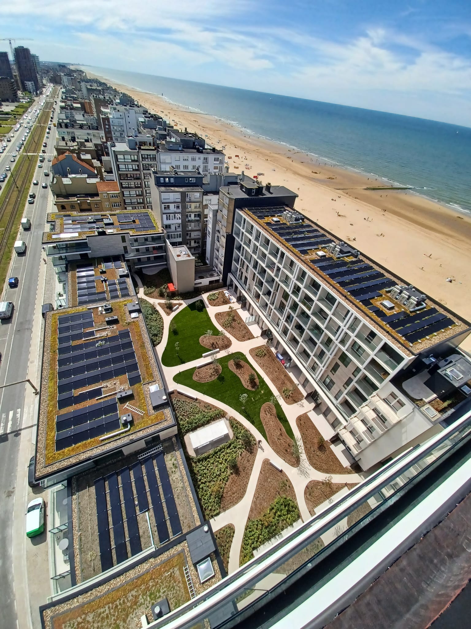 Er zijn 131 garageboxen en 54 parkeerplaatsen. Alles is in gereedheid gebracht om laadpalen voor elektrische voertuigen te installeren. Er is tevens een gemeenschappelijke fietsenberging voor 28 fietsen en 94 ondergrondse bergingen. De voormalige speelplaats van de school – die helemaal gebetonneerd was – is nu een groene binnentuin met wandelpaden waar het regenwater in de ondergrond kan infiltreren. Op de woontoren liggen er zonnepanelen die zorgen voor groene stroom (op het schuine mansardedak van de zeedijkvilla’s was dit niet mogelijk) en ook het regenwater wordt gerecupereerd.