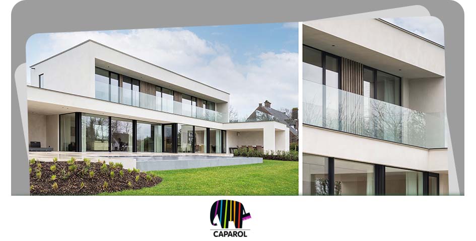 Strakke lijnen, hout en glaspartijen maar geen overdreven klinische look. Dat was de vraag die architect Els Verzele voorgeschoteld kreeg door de bouwheer in Drongen. Witte crepi was daardoor geen optie. Verzele ging grasduinen in het Caparol-aanbod en maakte kennis met verschillende gevelafwerkingsmogelijkheden, waaronder een betonlook.