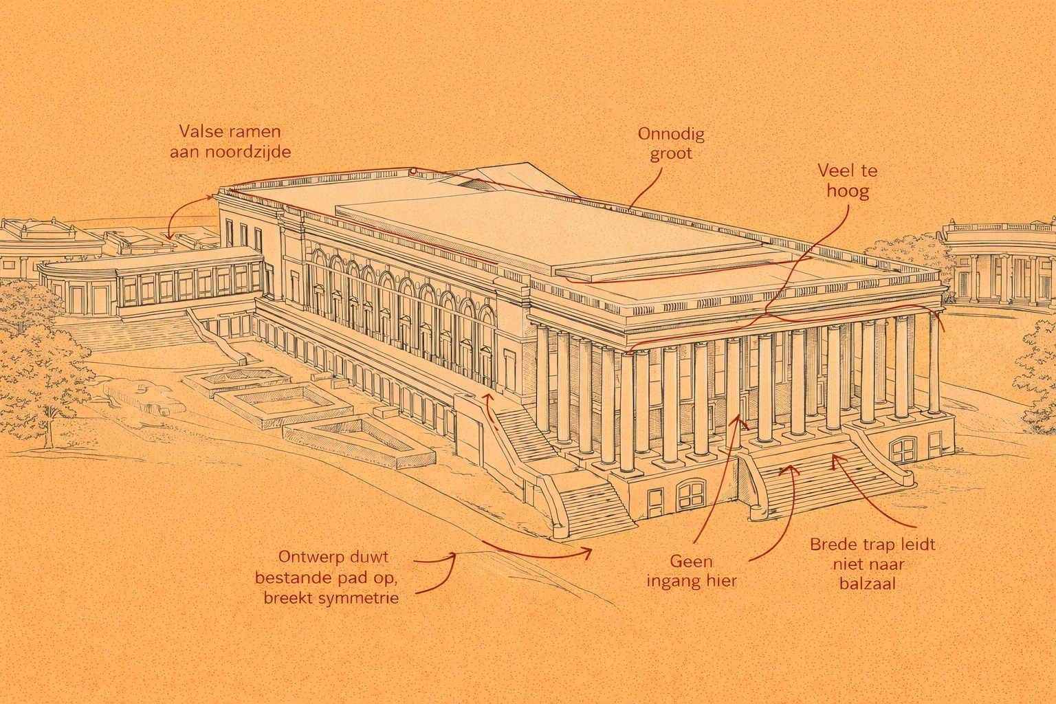 Het zuidelijke portico is misschien wel het meest absurde element van het hele ontwerp. Het is gigantisch, domineert de compositie en… leidt nergens naartoe. Geen deuren, geen toegang, geen programma. Pure façade, letterlijk. Alsof dat nog niet volstaat, staat er een dubbele rij kolommen die het zicht én het daglicht vanuit de balzaal blokkeren. Architectuur die haar eigen interieur saboteert: het is een zeldzame prestatie, maar hier gebeurt het zonder blikken of blozen.