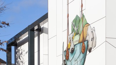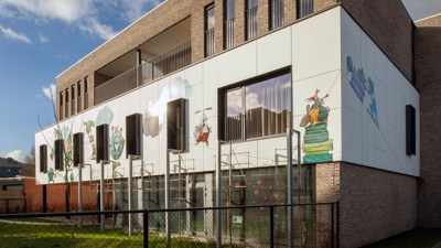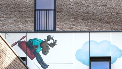 Een warm nest en helende thuis, dat is wat de architecten van BPA Groep Architectuur voor CKG Molenhof voor ogen hadden. Het resultaat is er en spreekt boekdelen, letterlijk. De Trespa Meteon Lumen-gevelplaten doen dienst als een mat, blank canvas en staan ten dienste van de bijzondere illustraties die als een rode draad doorheen het gebouw lopen, zowel buiten als binnen. Architectuur in functie van de kinderen die er verblijven, met een hartverwarmend verhaal dat verdient om verteld te worden.