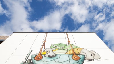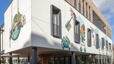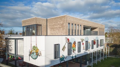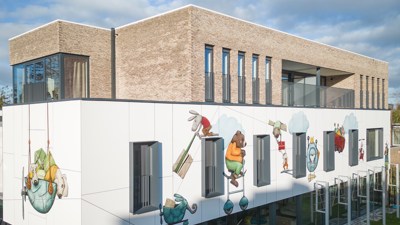Hubert: “De gewenste kunstintegratie bracht ons tot bij Jolanda Swennen, die prachtige illustraties heeft gemaakt. Centraal staan verschillende fictieve diertjes, elk ook met eigen rugzakje, die het gebouw tot leven brengen en de kinderen eveneens kunnen aanmoedigen hun verhaal te vertellen.”