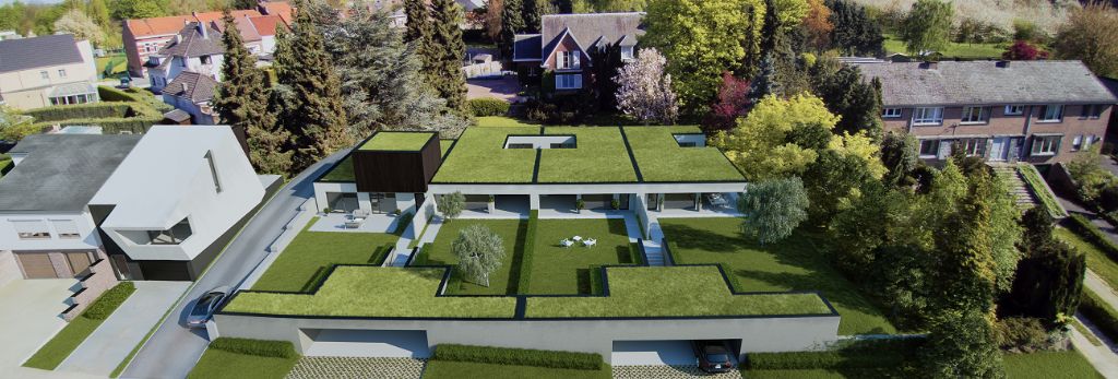 Een perceel van 29 are en 75 ca met slechts één wooneenheid, een villa uit de jaren zestig, wordt bebouwd met 5 bijkomende afzonderlijke wooneenheden. Door het grote hoogteverschil tussen de bestaande woning en de straat (7,33 m) worden de nieuwe woningen gedeeltelijk ingegraven. Enerzijds wordt tegen de wachtgevel van de linkerbuur een halfopen bebouwing voorzien. Anderzijds worden vier woningengebouwd op het plateau voor de villa. De woningen zijn opgevat als patiowoningen met een volledig gesloten achtergevel die zich ondergronds bevindt. De leefruimtes en keuken liggen aan de voorzijde met de tuinen. Alle patiowoningen hebben aan de straat een parkeerplaats en een bergruimte voor fietsen en huisvuilcontainers.