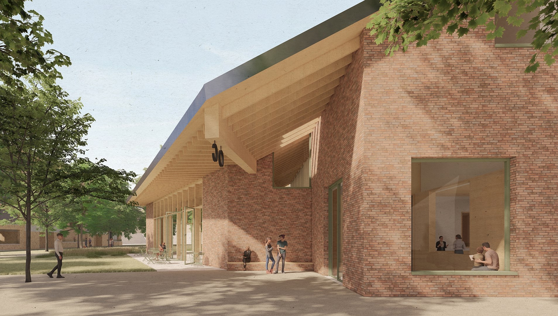 Het nieuwe cultuurhuis wordt strategisch geplaatst om de bestaande verhoudingen op de site te behouden en te versterken. In plaats van een dominant volume wordt het een dorpshuis met een open en uitnodigende identiteit. De toegang aan de Hoogstraat speelt een belangrijke rol in het ontwerp en zorgt ervoor dat het gebouw zich naar het dorp opent. Door de gevels aan drie zijden open te maken, ontstaat een synergie tussen het cultuurhuis, het cultuurplein en het park. De vormgeving en materiaalkeuze dragen bij aan de integratie in de omgeving. De gevels bestaan uit warme, natuurlijke materialen zoals hout en baksteen, waardoor het gebouw een tijdloze uitstraling krijgt en een huiselijk gevoel uitstraalt.