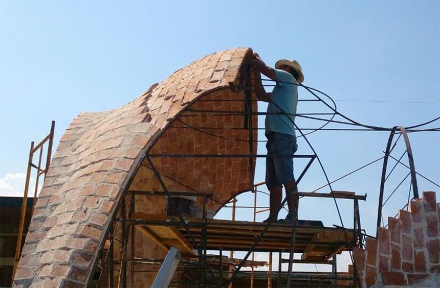 De meest verbluffende – maar onzichtbare – materiaalbesparing ligt echter in het achterwege kunnen laten van de houten bekisting. Het vraagt zeldzaam vakmanschap om Catalaanse gewelven te kunnen metsen zonder bekisting noch formelen, maar met enkel een spankoord en een ‘metsersoog’. De uitdrukking ‘Building the plane as you fly’ is hier op haar plaats.