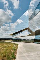 De expressieve ramen die zijn geplaatst tussen de ALUCOBOND Reflect-elementen lijken schaduwen op het gebouw en benadrukken de dynamiek van de architectuur. Dit project is overigens één van de zes genomineerden voor de tweejaarlijkse prijs Verluchte gevel toepassing, een initiatief van de Duitse organisatie VHF (www.fvhf.de).