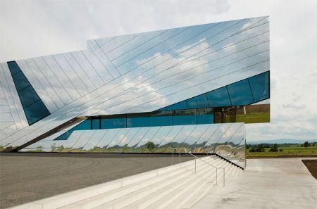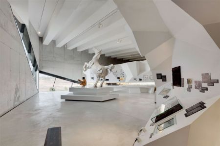 Van ver zichtbaar torent het nieuwe onderzoeks- en ervaringscentrum uit boven zijn omgeving. Zoals gelaagde aarde stijgt het bouwvolume boven de natuurlijke lagen uit en bakent zo de plaats af als verwijzing naar de belangrijke archeologische vindplaats. De futuristische vorm ontwikkelt zich vanaf de horizontaliteit van het landschap in de hoogte en door het frivool verschuiven van volumes zijn er gedifferentieerde binnen- en buitenruimtes ontstaan.