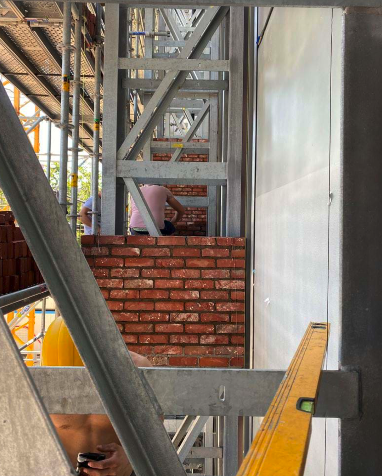 Ook de grote vinnen zijn traditioneel gemetst. Om dit te realiseren is een stalen vakwerk met L-profielen gebruikt als basis en daarrond zijn de stenen vermetst. De binnenkanten zijn dus hol en 60 cm breed op 1,3 meter diep. Om de 3 meter werd ook een uitzettingsvoeg voorzien in dezelfde kleur van de cement die ook opgeruwd is. Hierdoor vallen deze niet op en ogen de bakstenen zuilen massief. De overkraging is gerealiseerd met strips die gekleefd zijn op platen die met een lattenstructuur bevestigd zijn aan het plafond.