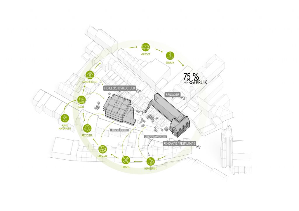 Bij de opmaak van het ontwerp werden verschillende aspecten van circulair bouwen zorgvuldig afgewogen en samengevoegd tot een coherent geheel, met als doel niet enkel de negatieve impact te beperken, maar ook een positieve impact te realiseren, vandaag én in de toekomst. Hergebruik vormt hiervoor de basis. De behouden gebouwen en hun structuur alsook de nieuwe toevoegingen vormen open dragers die veranderlijk worden ingevuld en zo verschillende toekomstscenario’s mogelijk maken. De materiaalkeuze, zoals bijvoorbeeld de gevels met recuperatiebaksteen en kalkmortel, is afgestemd op die aanpasbaarheid en op het ritme van de functionele lagen, om een lange levensduur en lage materiaalimpact zo goed mogelijk te verenigen.