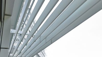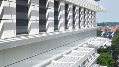 Op andere locaties in het gebouw integreerden de architecten windvaste screens (type Fixscreen Mono AK of Fixvent Mono AK), die een ventilatierooster voor de continue toevoer van verse lucht combineren met een windvaste doekzonwering. Beide systemen zijn uitgerust met een geleidingssysteem met ritsprincipe, waardoor ze zelfs windsnelheden tot 130 km/h weerstaan. Bovendien loopt de screen soepel en geruisloos door de geleiders en de onopvallende onderlat verdwijnt helemaal in de kast bij screens met een hoogte tot 2700 mm, bij hoogtes tot 6000 mm gedeeltelijk. Dankzij de integratie van akoestisch materiaal in de kast van de screen wordt ook elke hinder door omgevingslawaai vermeden.