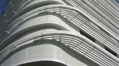 Het Jan Palfijn Ziekenhuis kreeg een compleet nieuwe gevel. Alleen de sokkel, bestaande uit blauwe hardsteen, bleef behouden. De aannemer stripte de rest van het gebouw tot op de betonstructuur, bracht een nieuwe isolatielaag aan, met daarop een waterdichte folie en een witte gevelbekleding uit gelakte aluminium cassettes, die met vloeiende lijnen de verschillende blokken tot een eenheid samenbrengen.