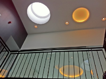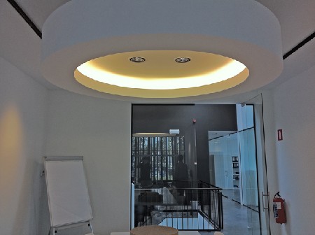 Binnenin werd gekozen voor mix van loft-kantoor en verder klassevol afgewerkte kantoren met specifieke ingewerkte lichttoestellen, strakke witte meubels die in contrast staan met het zwarte gebouw.
