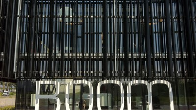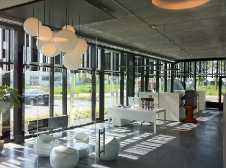 Voor de kantoren werd er gekozen voor een volledig glazen gevel voorzien van een voorzetwand met lamellen die ook hier vernieuwend vertikaal en onder variable hoek werden geplaatst. Deze plaatsingswijze werd geïnspireerd op de vormgeving van een streepjescode. Deze verticaliteit werd continu doorgetrokken en geeft het gebouw een sterke tijdloze en architecturale uitstraling.