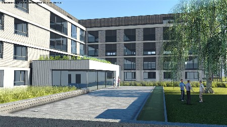 Het schaalniveau van de omliggende gebouwen wordt hernomen in het nieuwbouwproject en het bouwvolume wordt geïntegreerd in een nieuw aangelegde parkomgeving. Er wordt gestreefd naar een sobere en duurzame uitstraling die aansluit op de bestaande context. Dit wordt gerealiseerd door het hernemen en herinterpreteren van geveldetailleringen, materiaal – en kleurgebruik van de omliggende gebouwen.