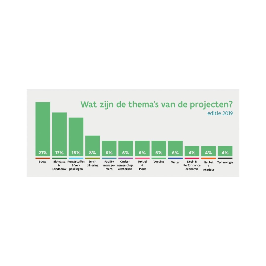 Ook in deze editie kregen projecten uit erg diverse sectoren een positief advies van de jury en dus subsidies. Bouwprojecten zijn met 21% het sterkst vertegenwoordigd. Ook in de vorige edities was ongeveer één project op 5 bouwgerelateerd. Nieuw dit jaar zijn de projecten rond facility management: voor het eerst verschijnen poetsdiensten en anderen dienstleveranciers op het toneel.