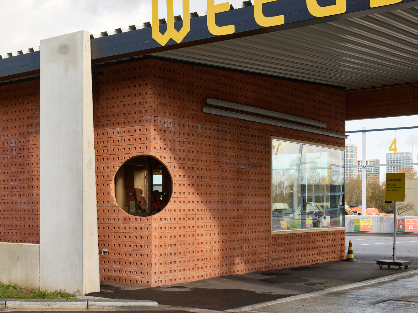 Het recyclagepark Kielsbroek in Antwerpen, ontworpen door Bovenbouw Architectuur, positioneert zich nadrukkelijk als infrastructuur binnen een sterk veranderende industriële context. Door het park op schaal te ontwerpen, krijgt het project voldoende présence tussen bestaande en toekomstige bedrijvigheid. De natuurlijke helling van het terrein werd slim ingezet: het recyclageplatform ligt hoger dan de containers, waardoor grondverzet tot een minimum beperkt bleef en het circulatieprincipe helder leesbaar is.