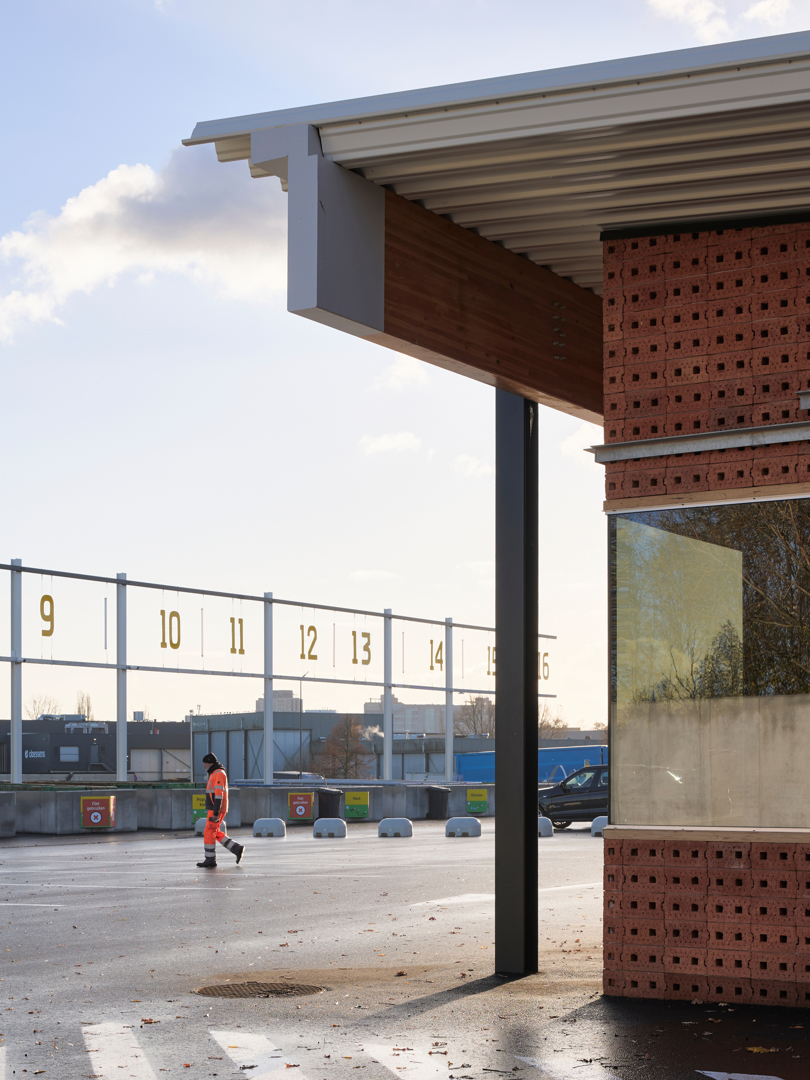 De site wordt aan de ene zijde begrensd door een luifel en het personeelsgebouw, en aan de andere door stevige keermuren voor de containers. Die heldere tweedeling structureert het terrein en maakt de logistiek intuïtief. Een opvallende, overgedimensioneerde houten balk verbindt het personeelsgebouw visueel met de luifel, terwijl een slanke maststructuur de containerzone markeert en het geheel een herkenbaar silhouet geeft.