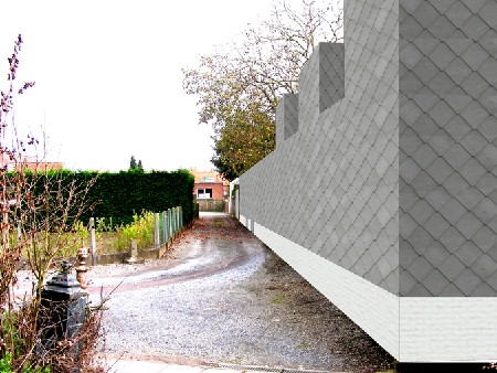 Omdat het hier gaat over nieuwe gebouwen op een bestaande site, heeft Brik Ontwerpatelier materialen uitgekozen die zich aanpassen aan de omgeving. Die omgeving wordt gekenmerkt door achterbouw en groen. De materialen (natuurleien voor de bovenbouw, betonstenen voor de plint) herhalen op een gevarieerde wijze de typische achterbouwcultuur.