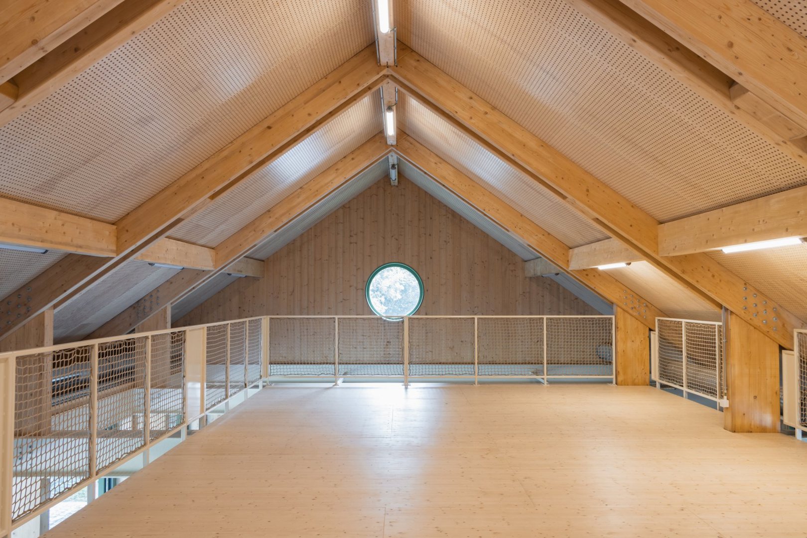 Het interieur van de hoeve is functioneel ingedeeld om diverse activiteiten binnen de jeugdkamer mogelijk te maken. Op de begane grond bevinden zich een vestiaire, een ruime polyvalente zone, een keuken en sanitair, aangevuld met een backstage ruimte voor evenementen. De bovenverdieping is ingericht met ruimtes voor administratie en techniek, evenals een workshopruimte voor creatieve sessies. Dankzij deze indeling kan het gebouw optimaal worden ingezet als de centrale spil voor de jeugdwerking in het district.