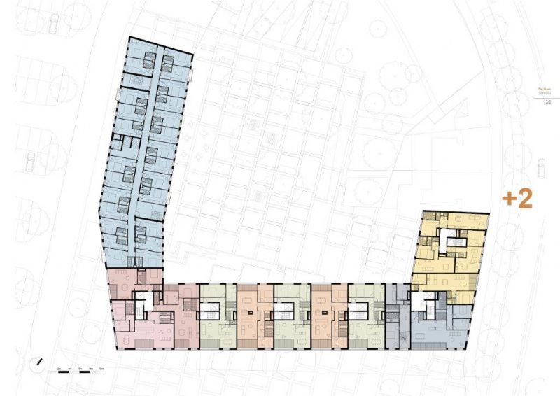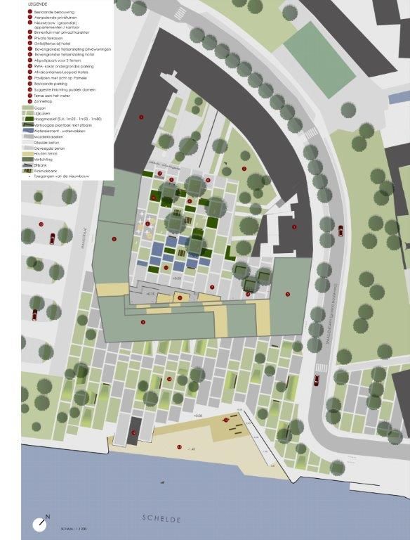 Het ontwerp streeft naar een maximale verweving met het stedelijke weefsel en focust tegelijk op een grote inherente diversiteit. Deze twee insteken vormen het basisconcept voor de projectsite. Het programma bestaat uit een hotel, diensten- of kantoorruimtes op de gelijkvloerse verdieping en een hoofdaandeel wonen. Voor de verschillende programma-onderdelen wordt gezocht naar hun logische plaats op de site; zo wordt wonen optimaal op het water gericht. Binnen het bouwblok wordt een duidelijke keuze gemaakt om in zowel volumetrie als in architectuur te kiezen voor aparte entiteiten en dus een duidelijk leesbaar onderscheid tussen de verschillende programma-onderdelen te maken.