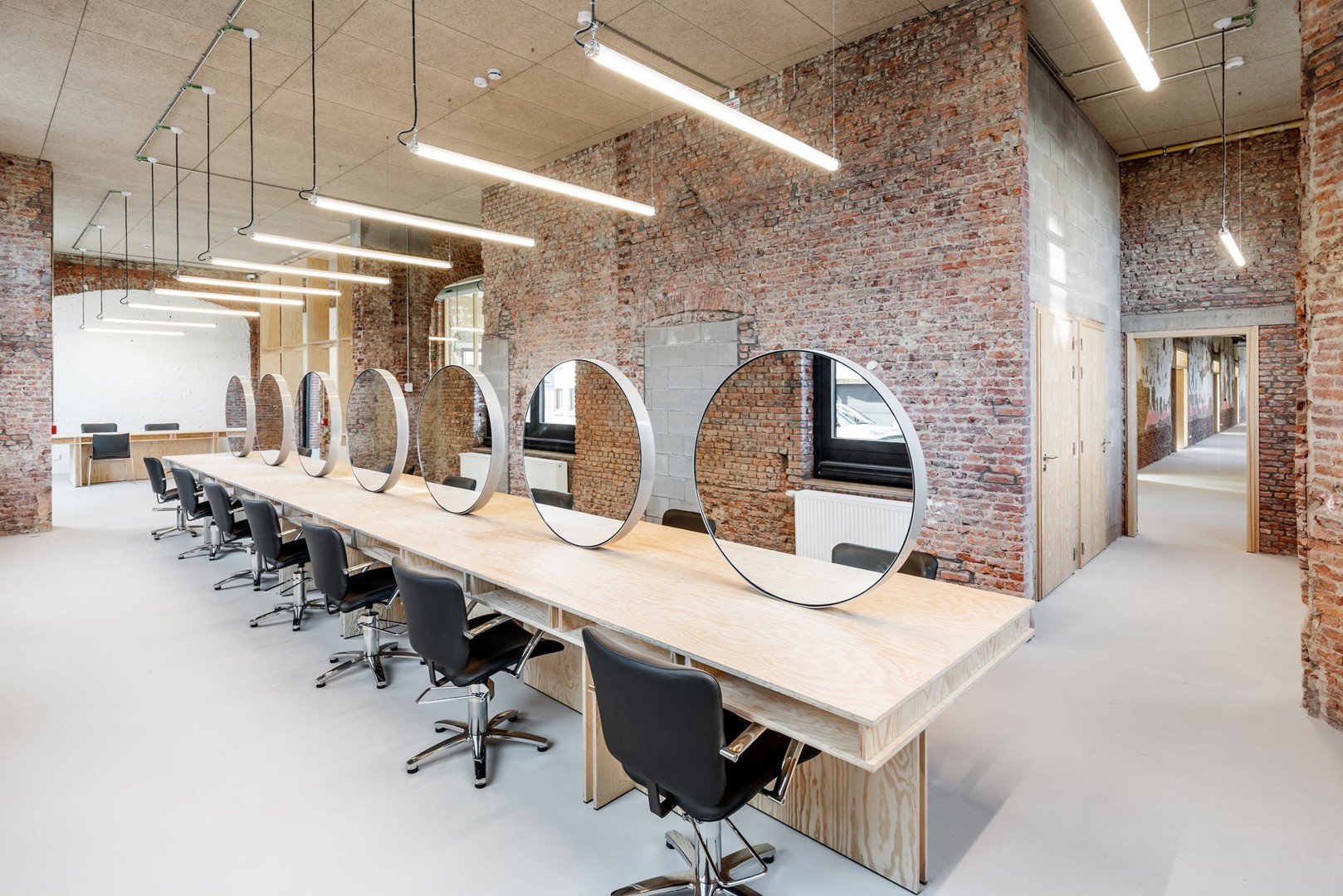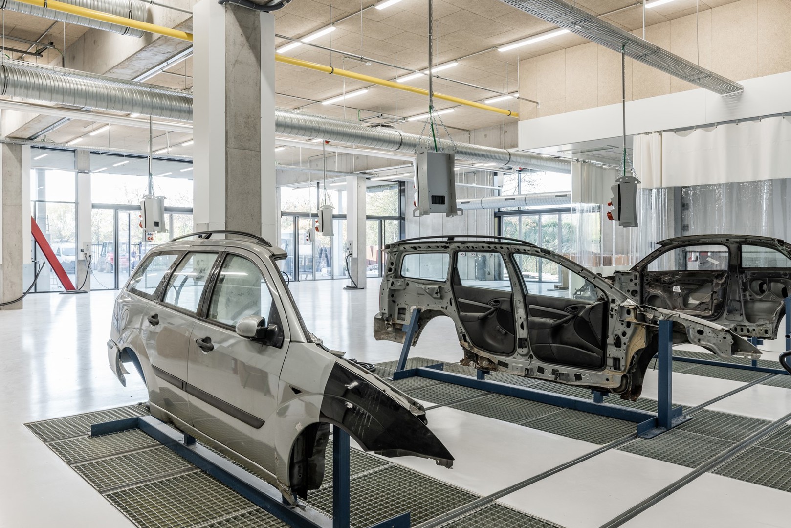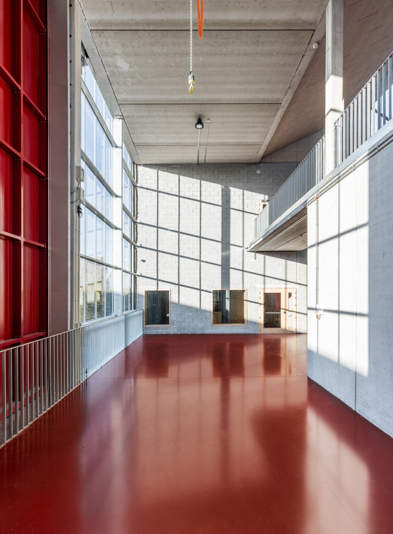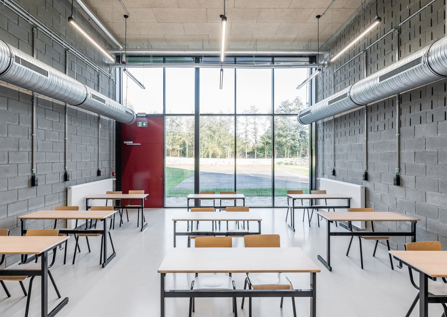 Met hetzelfde doel voor ogen, maar ook zodat ze in de toekomst makkelijk hergebruikt kunnen werden, ontwierpen we ook alle technieken in de gebouwen volledig zichtbaar en in opbouw. Mooi meegenomen is dat ze zo ook als didactisch materiaal gezien – letterlijk – kunnen worden voor de leerlingen van de industriële afdelingen van de school.