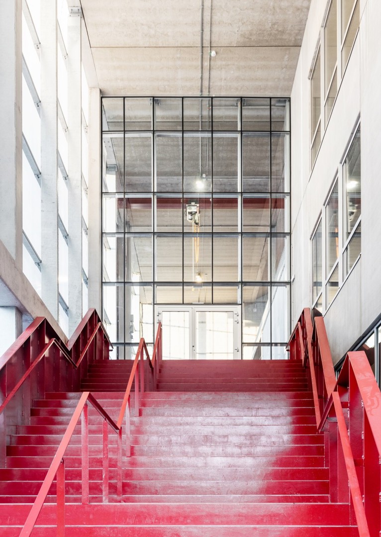Aan de westelijke zijde van de site kwam een volledig nieuw en compact gebouw van drie bouwlagen hoog met faciliteiten voor voornamelijk industriële schoolopleidingen en sport. De algemene circulatiezones, die zijn opgevat als semibuitenruimten, liggen centraal op iedere verdieping in het gebouw. Ze zorgen voor de dialoog tussen de binnenkant van het gebouw en de omgeving buiten.