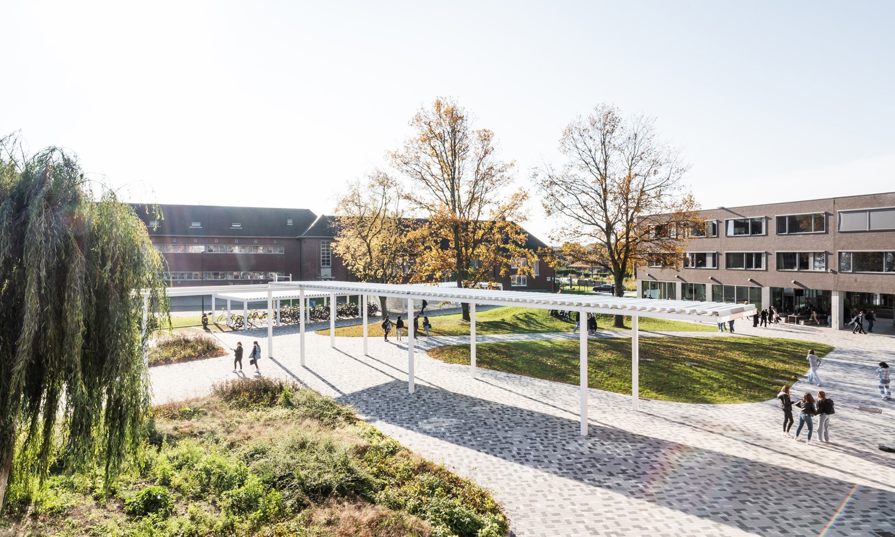 De drie gebouwen (op het terrein staat ook nog een ander schoolgebouw waar in de vernieuwing van de site niets mee gebeurde, red.) zijn met elkaar verbonden door een continuüm van openbare en semiopenbare ruimtes. Drie pleinen, het Ariaplein, Schoolplein en Werkplein, scheiden en verbinden de gebouwen tegelijkertijd en vervullen een functie als speelplaats.