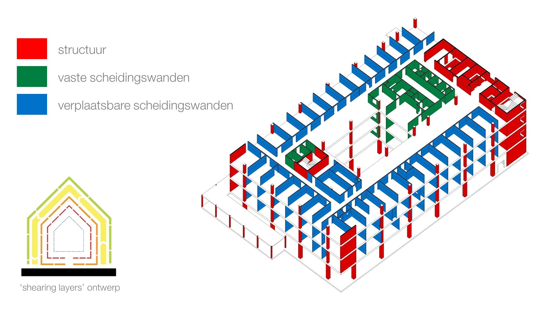Een aantal vaste kernen zijn geïdentificeerd. Die worden uitgevoerd in vaste wanden. Alle overige wanden worden verplaatsbare systeemwanden. Die zijn eveneens modulair geconcipieerd. De binnendeuren zijn gepositioneerd binnen die module, zodat ze eenvoudig kunnen verplaatst of omgewisseld worden.