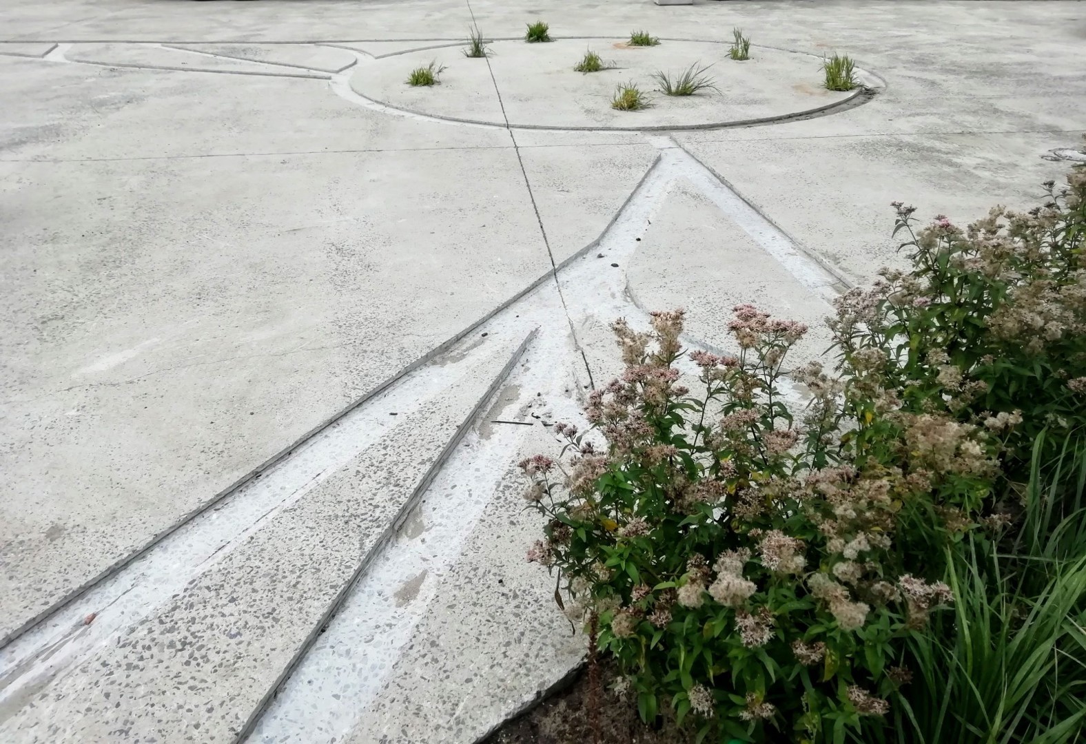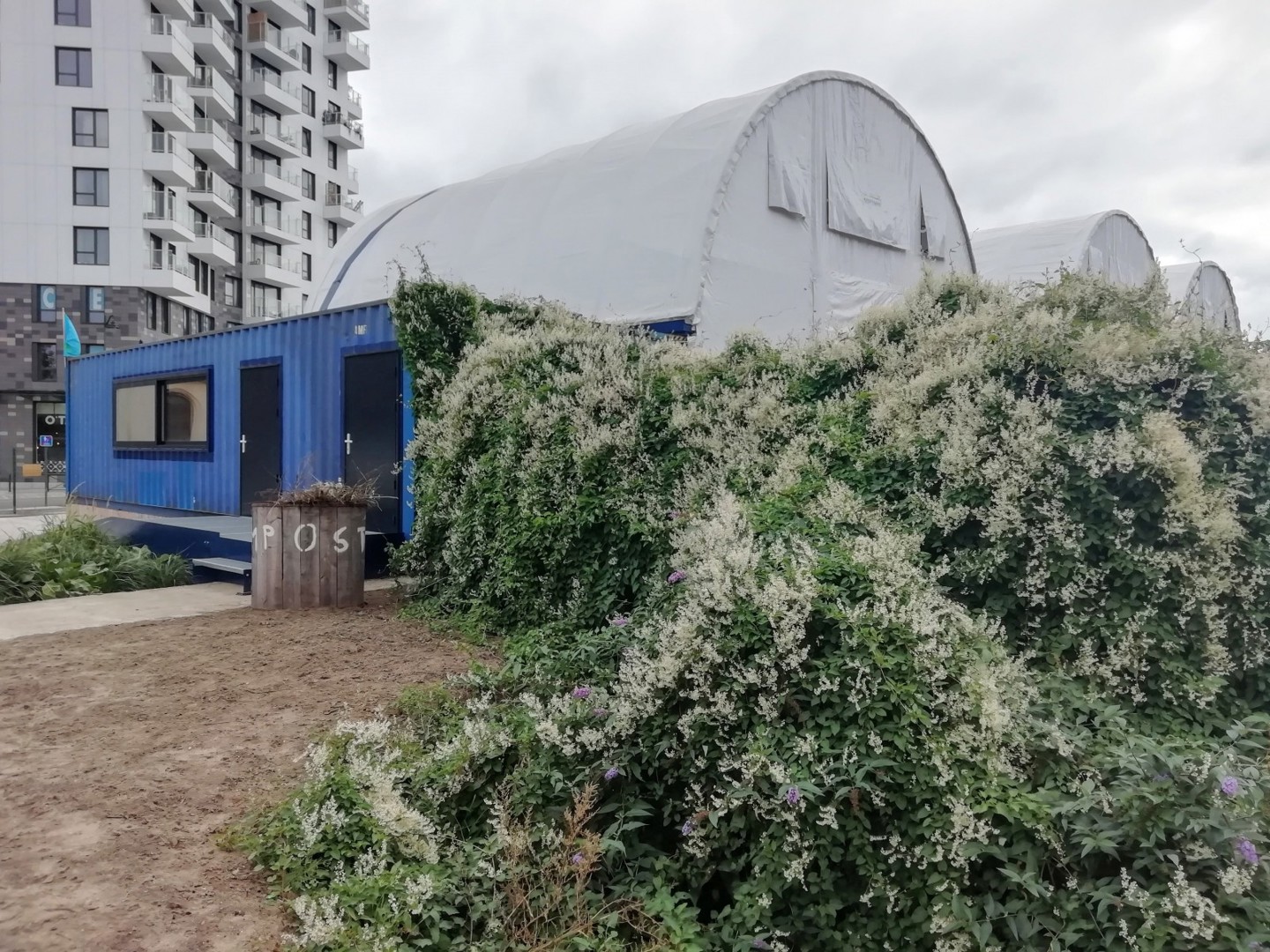 Niet echt circulair, maar wel duurzaam, is dat Molenwest Square ook voorziet in heel wat groen. Voor die groenstructuur vertrokken we van de spontane begroeiing op de site. Voor het onderhoud van al dat groen zorgen de jongen die gebruikmaken van de site.