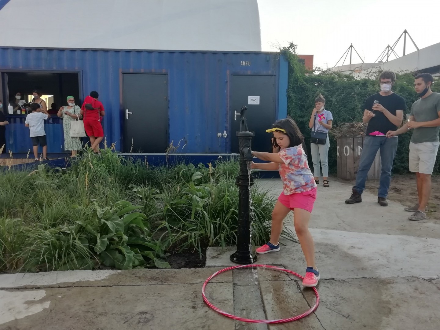 Hemelwater wordt, op de overkappingen, immers gerecupereerd en gebruikt in het project, niet alleen huishoudelijk maar ook als ludiek speelelement op de zogenaamde waterspeelplaats. Het overschot wordt geïnfiltreerd op verbeeldende wijze.