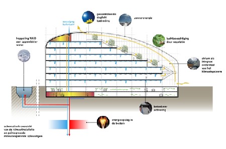 De kantoren bevinden zich op de verdiepingen boven de publieksruimtes. Een oostelijke en een westelijke kantoorbeuk zijn verbonden door een noordelijke zone met liften, voorzieningen en het verticale installatietransport. Een U-vormig plan omarmt zo het zuidelijk gerichte atrium, waarop alle kantoorzones zicht hebben. Het atrium fungeert als centrale ontmoetingsplek voor gebruikers en bezoekers, speelt daarnaast een belangrijke rol in het installatieconcept en draagt door het grotendeels glazen dak in hoge mate bij aan de transparantie van het ontwerp.