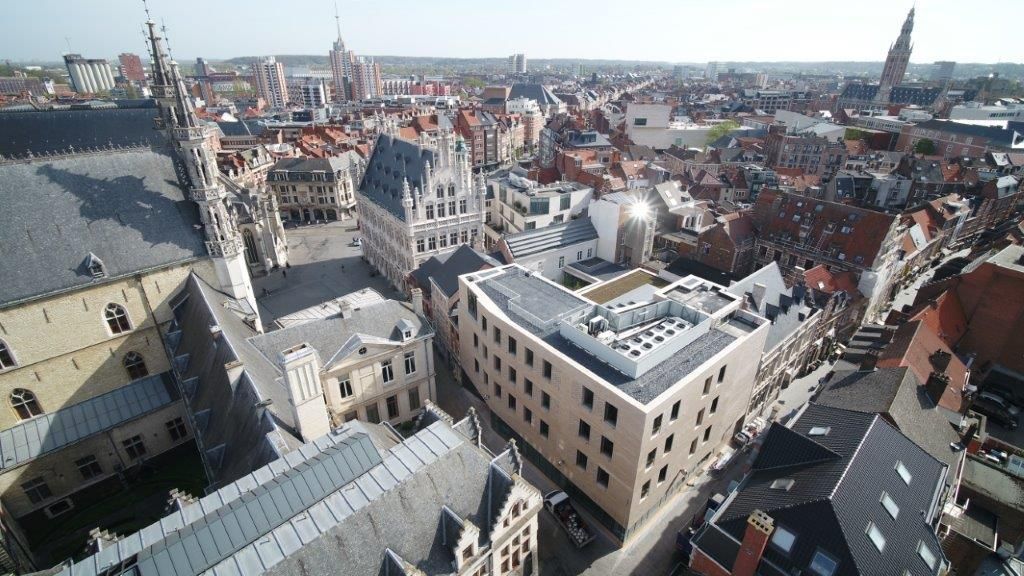 Omdat Monument Vandekerckhove zowel restauratie als nieuwbouw kan combineren, bleek de bouwonderneming uit Ingelmunster voor Cera de geknipte kandidaat. “We kennen als geen ander de complexiteit van werken in een drukke binnenstad”, aldus Tine Schotte, uitvoeringsdirecteur bij Monument Vandekerckhove. “Het lot restauratie omvatte het Helleputtegebouw, een neogotisch pareltje in de binnenstad waarin burelen rond de centrale traphal zijn gegroepeerd, en Hôtel d’Eynatten, een laatzeventiende-eeuws bouwwerk waarvan de gevel opgetrokken is in een rijk gedecoreerde blauwe hardsteen in de stijl van Lodewijk XV. Binnen het lot restauratie hebben we alle specialisaties in eigen beheer uitgevoerd, ondersteund door onze zusterbedrijven MSC, MRT, Altritempi en onze eigen ateliers voor archeologie, glas in lood, natuursteen en schrijnwerkerij.”