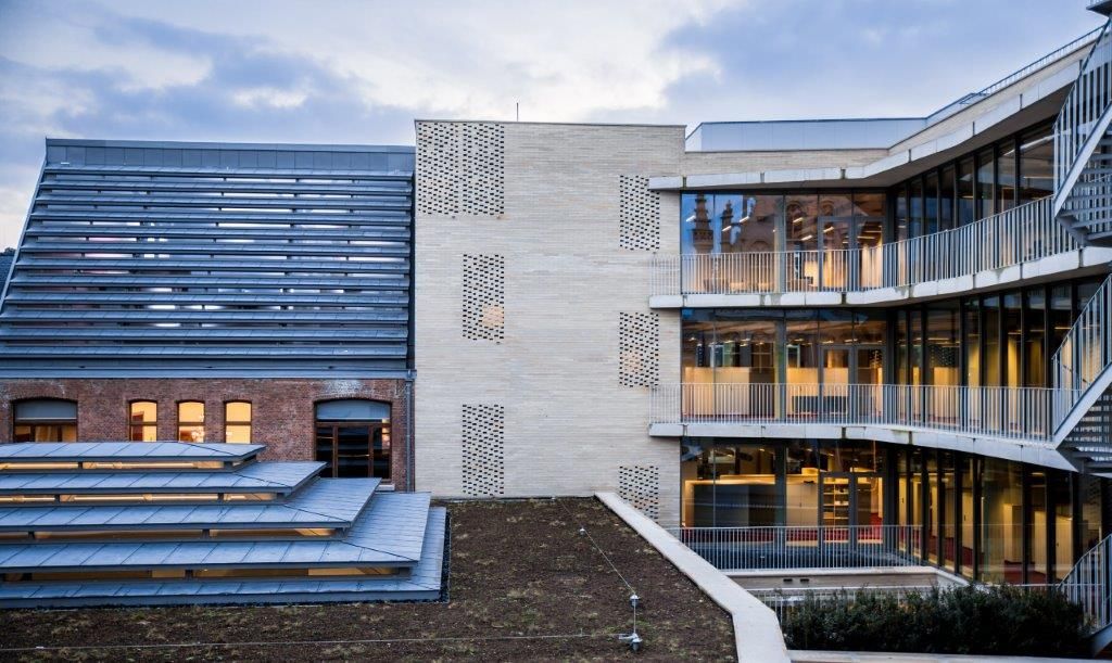 Robbrecht en Daem architecten is erin geslaagd om op subtiele wijze een hedendaags gebouw in te passen in het historisch centrum van Leuven. “Door het slopen van de Vlaamse Leergangen ontstond er een grote openheid jegens de twee geklasseerde gebouwen”, vertelt projectarchitect Florence Daem. “De oude gebouwen zijn door middel van een aantal patio’s met elkaar verbonden. De ene patio wordt omringd door een grote inkom, een vergaderzaal en de voormalige lokettenzaal, die toegang geeft tot de andere patio. Die laatste wordt op zijn beurt omringd door de lunchroom en de secundaire ingang in de Eyckstraat. De drie gebouwen zijn met elkaar verbonden via landschappelijke dakvelden.”
