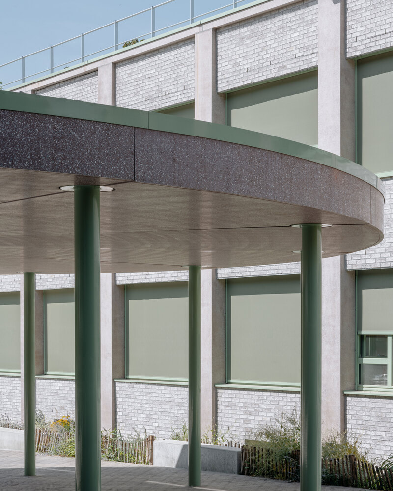De nieuwe schil is geen neutrale jas, maar reageert doelgericht op het programma erachter. Aan de straatzijde, waar vooral circulatiezones liggen, is de gevel meer gesloten om warmteverliezen te beperken, terwijl voldoende daglicht behouden blijft. Aan de speelplaats openen de gevels zich juist maximaal, zodat klaslokalen en kantoren kunnen profiteren van overvloedig natuurlijk licht.