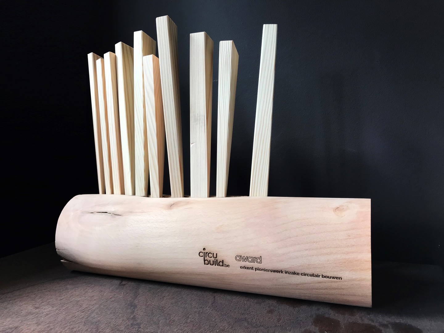 De gloednieuwe Circubuild-award, die er kwam in het verlengde van deze website en de inspanningen van pioniers in circulair bouwen looft, werd ontworpen door de afdeling Interieur Design & Architectuur van Thomas More. Het ontwerp staat bol van de symboliek. En niet alleen omdat hout, een hernieuwbaar materiaal, werd gebruikt. “Elke winnaar moet er op zijn beurt een pijnpunt voor circulair bouwen uit verwijderen en dat ook benoemen”, vertelt Stefan van Ouytsel van Thomas More.