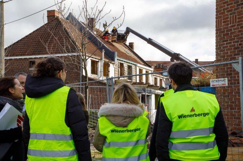 Op een druk bijgewoonde persconferentie en een werfbezoek dat op evenveel belangstelling kon rekenen gaven architecten Ana Castillo en Lieven De Groote en Wienerberger gisteren een interessante inkijk in hun circulair experiment dat ze momenteel realiseren voor de sociale huisvestingsmaatschappij Wonen Regio Kortrijk. Interessant aan dit project is dat circulariteit op verschillende niveaus bekeken wordt, niet louter op materiaalniveau.