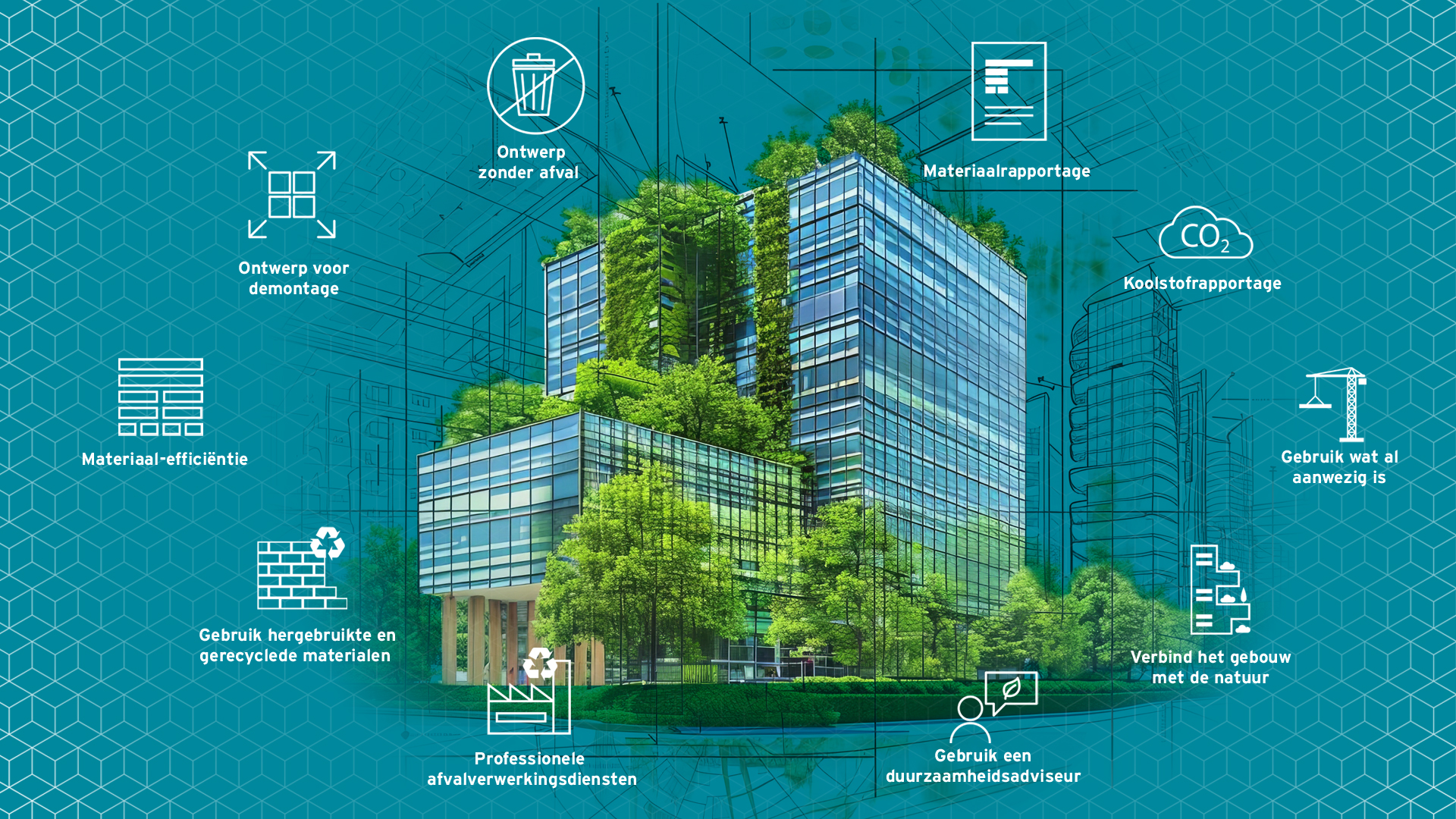 - Materiaal-efficiëntie: gebruik zo weinig mogelijk materialen terwijl je voldoet aan de bouwvoorschriften. Dit kan door lichtgewicht structurele ontwerpen, prefab elementen en standaard materiaalafmetingen te gebruiken om afval te verminderen, wat de circulariteit bevordert.