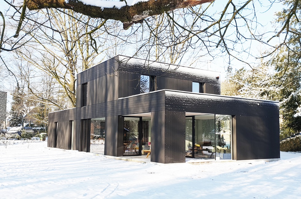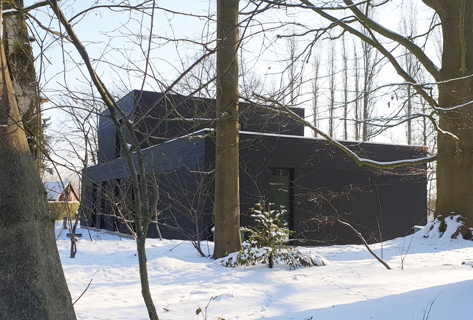 De vakantiewoning werd volledig gestript en voorzien van nieuwe isolatie – ze was amper geïsoleerd. Omdat TOOP architectuur vanuit circulair oogpunt de bestaande funderingsplaat wilde hergebruiken zonder die uit te breiden en ook geen andere bodemingrepen wilde doen, koos het voor houten gevelbekleding. Aan de zijdes die het meeste zon vangen, werd gebruikgemaakt van geïntegreerde screens, die volledig weggewerkt werden en dus onzichtbaar zijn. De houten gevelbekleding is donker, wat ze robuuster maakt in de bosrijke omgeving en er ook voor zorgt dat de vakantiewoning opgaat in het landschap. Het lijnenspel van de gewisselde richtingen is subtiel maar toch verrassend.