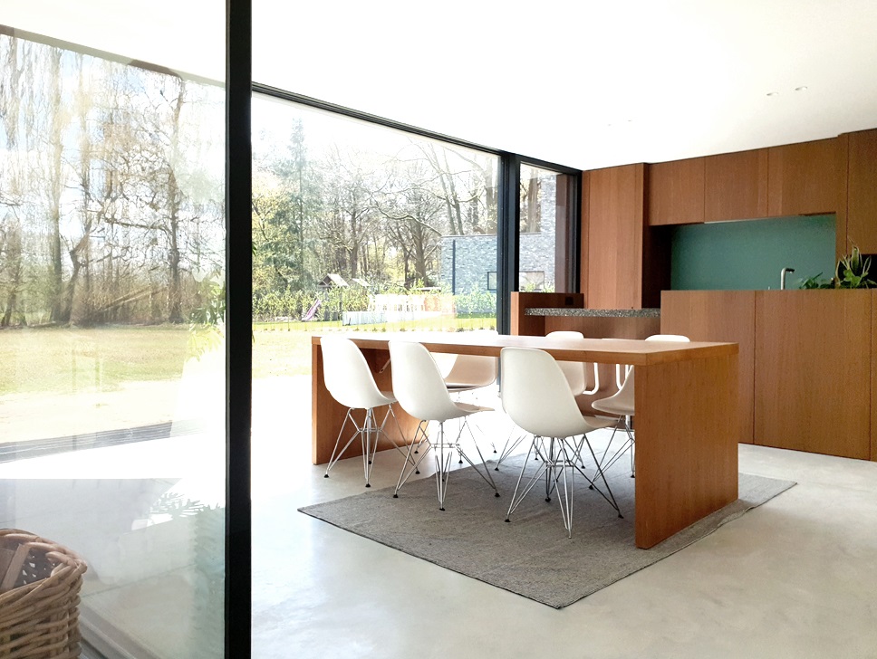De zitplaats heeft zicht naar de straatkant en – door een overdekt terras – naar de tuin. De keuken, grenzend aan het overdekte terras, kijkt uit op de tuin en vormt het hart van de woning. Ook de masterbedroom ligt aan de tuinzijde. Het bureau/de speelruimte, met zicht op de straatzijde, vormt de schakel tussen de dag- en nachtzones. De garage, die zich voorheen bevond op de plek waar nu de zitplaats is, werd verplaatst naar de meest donkere zone van het perceel.