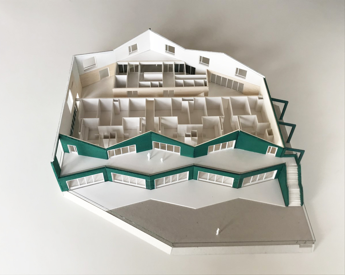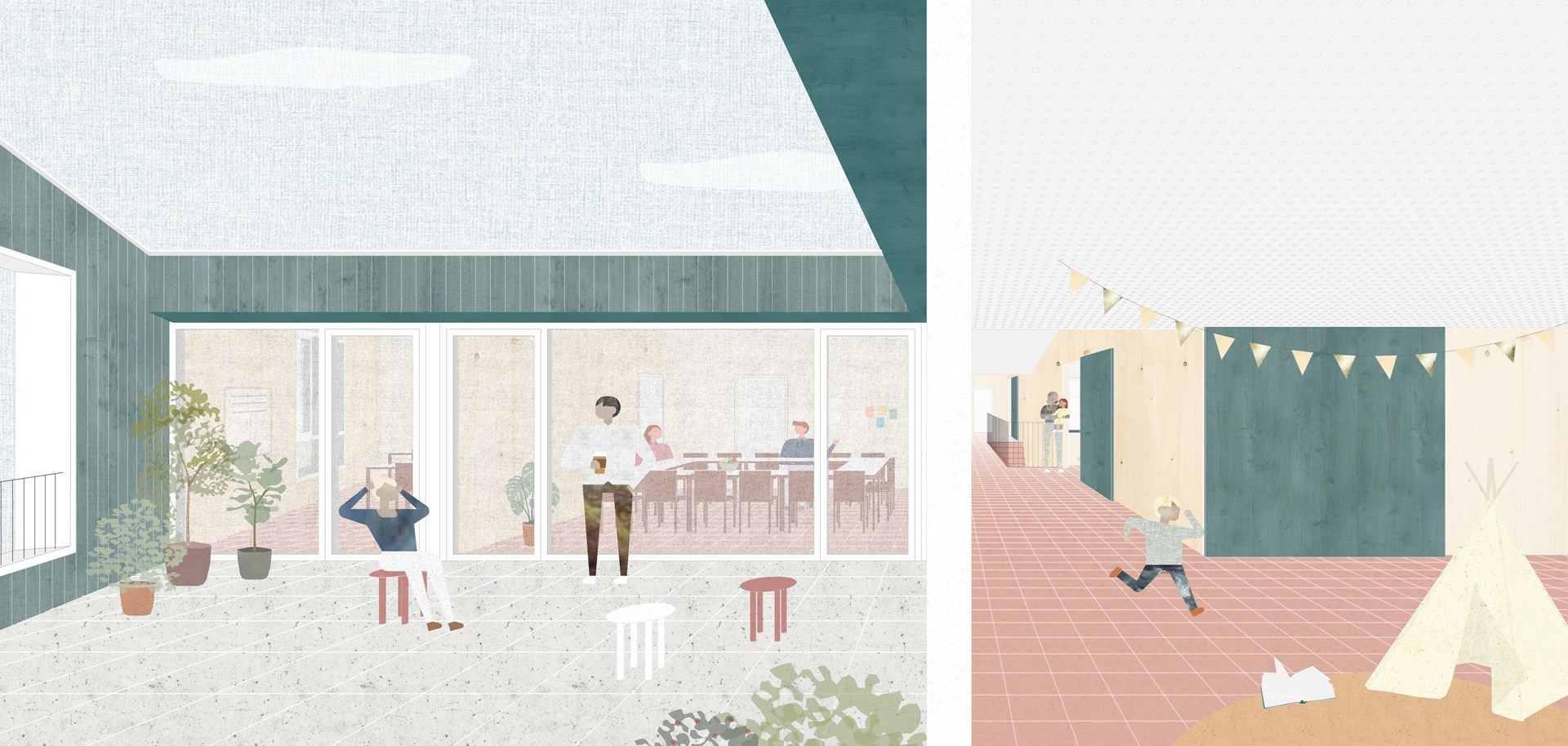 De draagstructuur in CLT en houten kolommen wordt ingevuld met een circulaire systeem van lichte binnenwanden, wat een flexibel gebruik van het gebouw garandeert. Nog met het oog op functionele aanpasbaarheid werd voldoende overmaat voorzien in de verdiepingshoogte. De polyvalente ruimte op het gelijkvloers zal overigens ook verhuurd worden wanneer het kan.