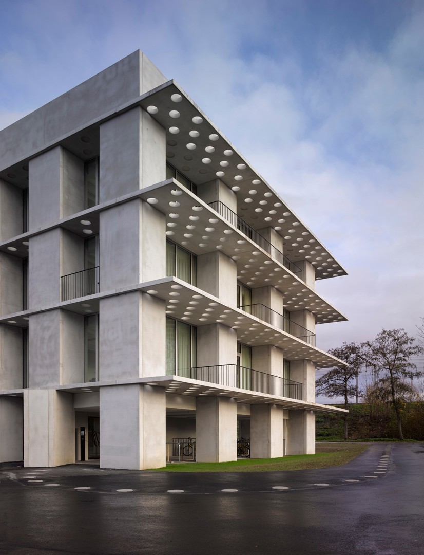 Toch werd de bestaande structuur uiteindelijk deels ontzien in het nieuwe gebouw. De architecten van OFFICE Kersten Geers David Van Severen kozen er in hun ontwerp, waaraan ook hp engineers (studie technieken), Bureau Bouwtechniek (projectondersteuning en EPB-advies en -verslaggeving) en Landinzicht Landschapsarchitecten (omgevingsaanleg) hun bijdrage hadden, immers voor een slanke onafhankelijke prefabbetonstructuur van kokers en luifels met daarop hier en daar balkons te ontwerpen rond de bestaande structuur. De betonkokers, 12 cm dik, hebben een eigen fundering en dienen om de luifels en balkons, elk 16 cm dik, te dragen. De nieuwe structuur uit geprefabriceerd architectonisch beton is slechts horizontaal verankerd aan het bestaande gebouw.
