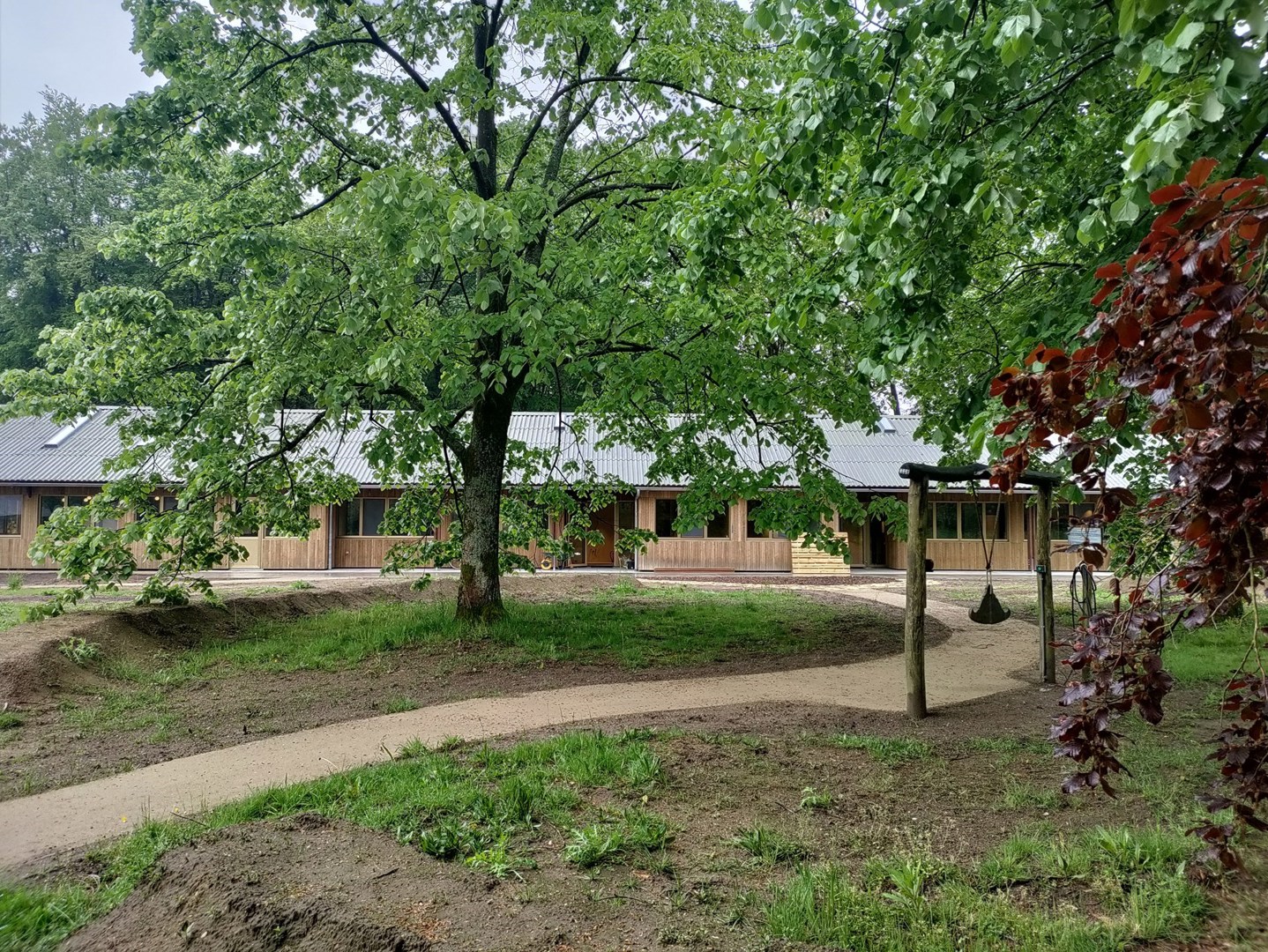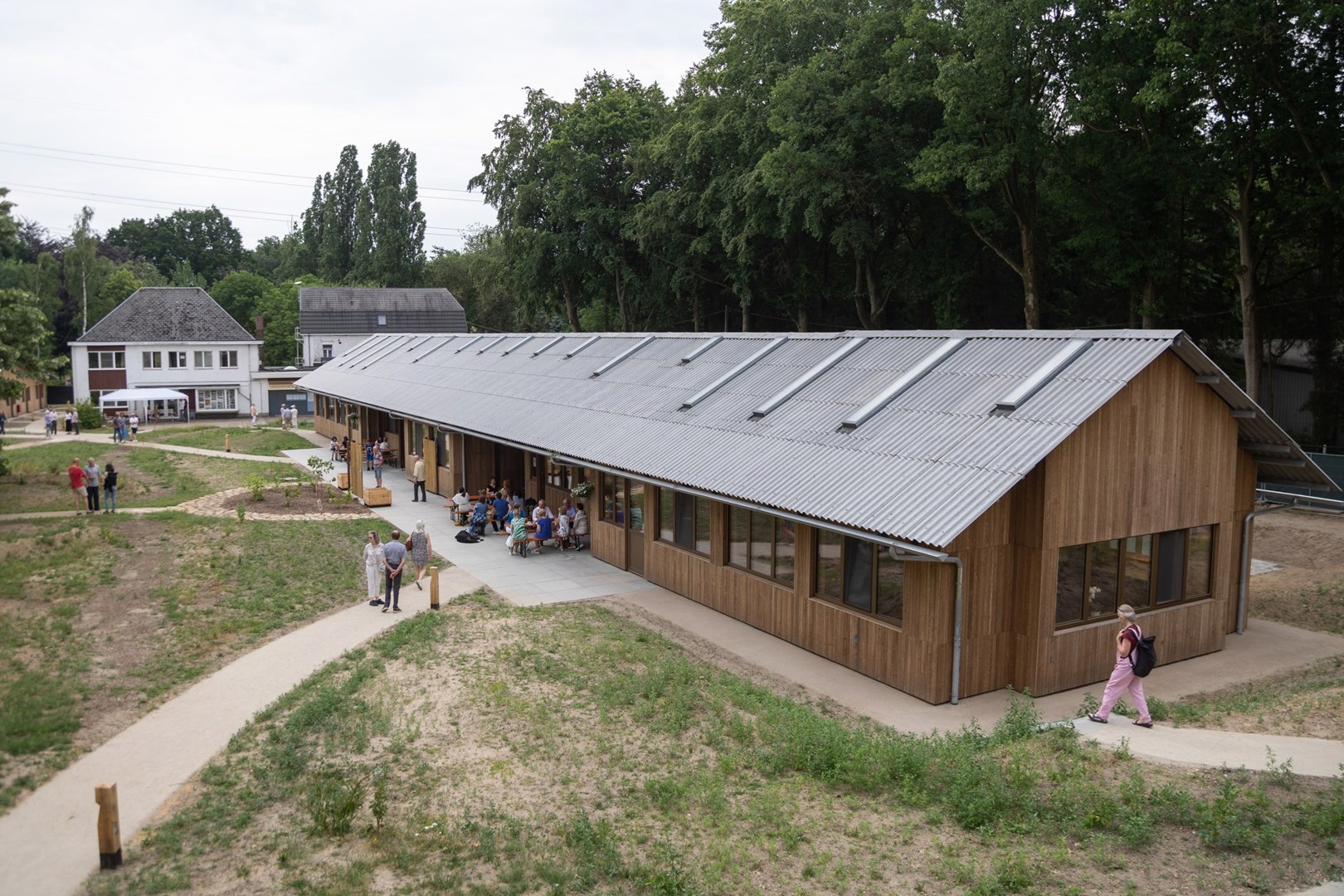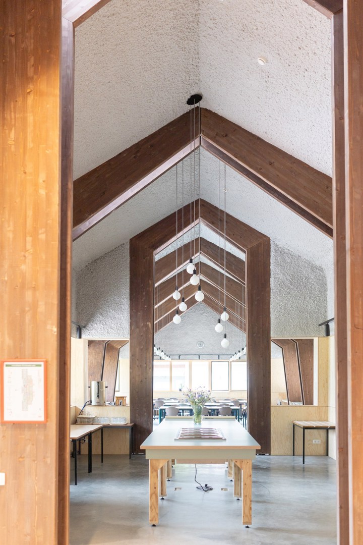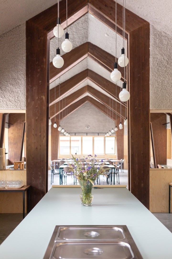 Zowel in het gebouw met de industriële keuken en het restaurant als in het gebouw om te verblijven werkte DMOA Architecten met akoestische massieve wanden in duurzame kalkzandsteen. Die wanden, die voor 95% bestaan uit zand en voor 5% uit kalk, zijn volledig recycleerbaar.