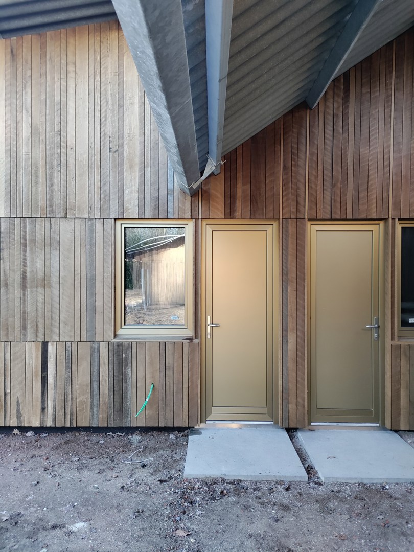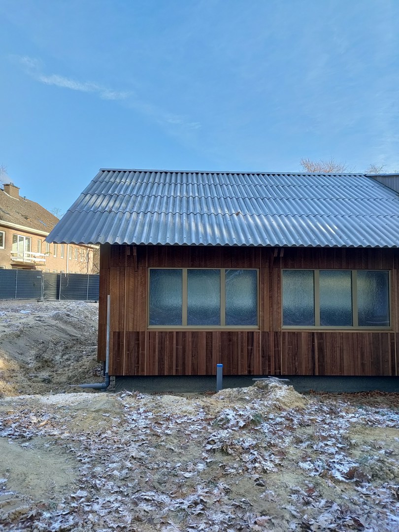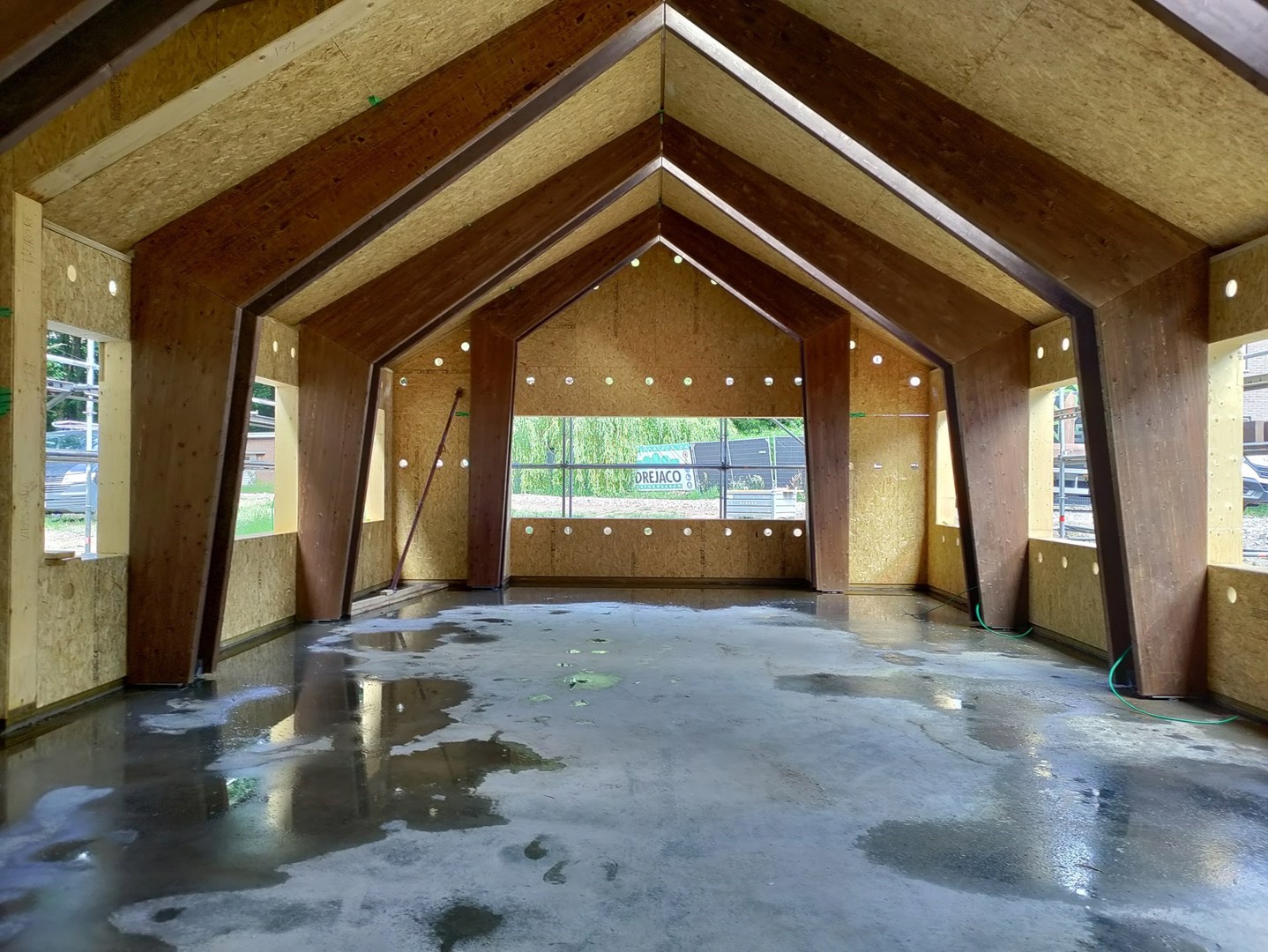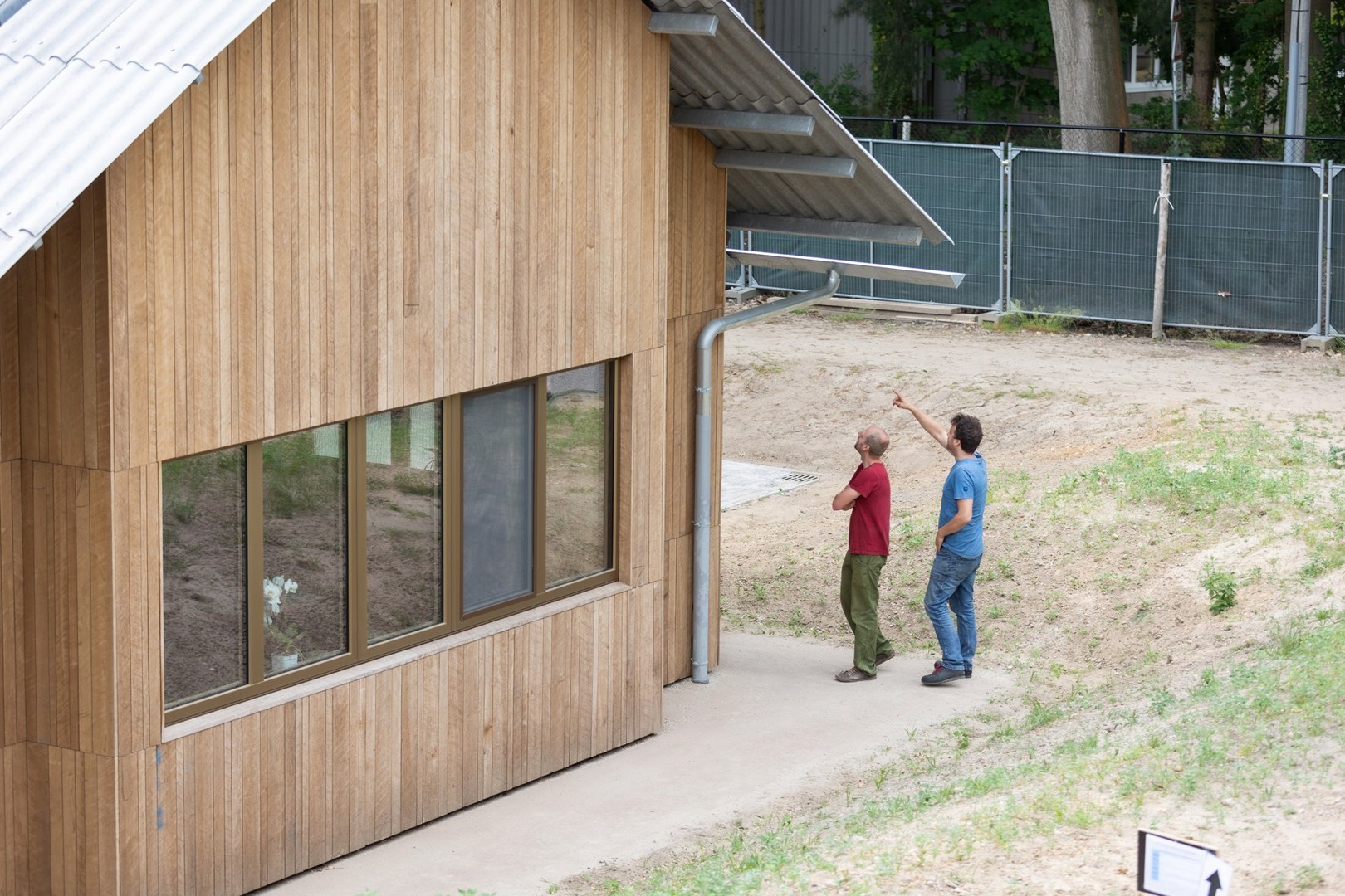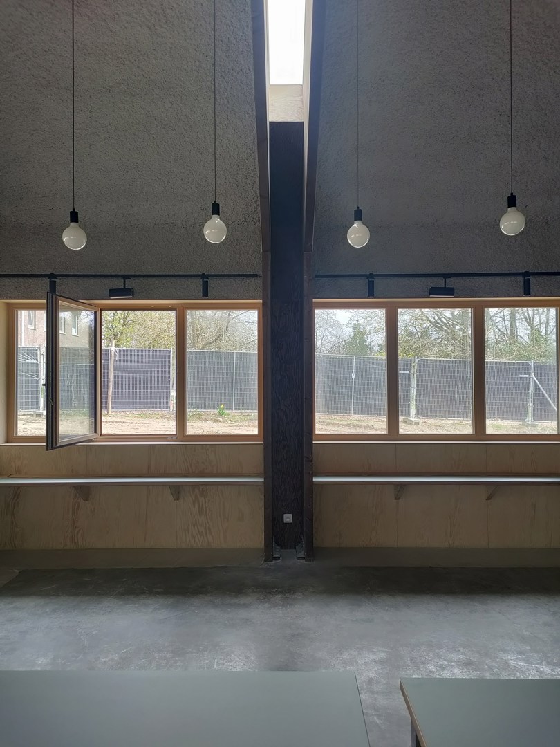 Voor de interieurafwerking werd sierplaatmateriaal uit multiplex gebruikt. Dat werd geschroefd en dus omkeerbaar verwerkt. Ook de golfplaten die de daken vormen, werden geschroefd geplaatst. De ramen, geleverd door een Kroatische firma, bestaan uit naaldhout, aluminium en driedubbele beglazing en hebben een Cradle to Cradle-certificaat.