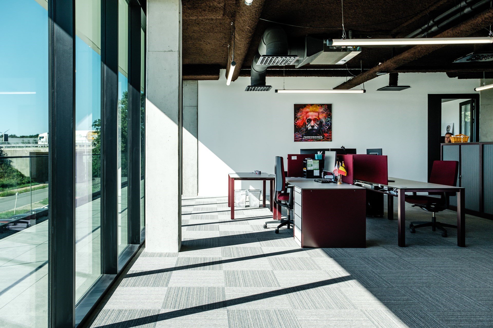 “Vervolgens kwam het erop aan om deze ruimtes flexibel in te delen. Zo kan de bouwheer later, dankzij een doordachte indeling van steunkolommen, op meerdere plaatsen scheidingswanden aanbrengen. Andere voorbeelden van circulaire ingrepen zijn de veelzijdige technieken die we inpasten in het gebouw – zoals de mogelijkheid tot simultaan verwarmen en koelen dankzij een driepijps-warmtepompsysteem - en de verhoogde vloeren die aanpassingen in bekabeling eenvoudig mogelijk maken. Tot slot is er bewust plaats voorbehouden aan de niet-kantoorzijde van het perceel, mochten er ooit uitbreidingsplannen komen voor het magazijn.”