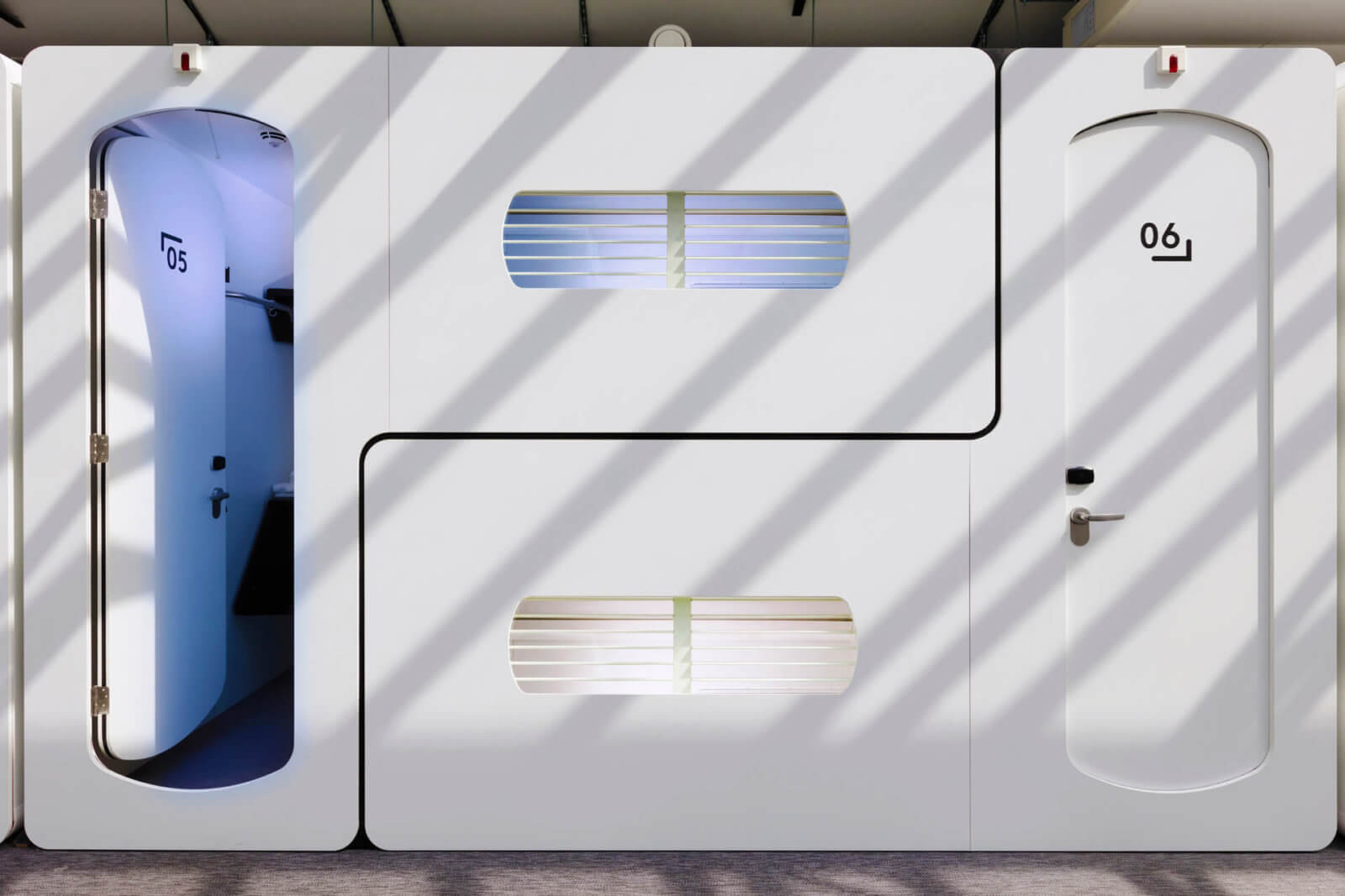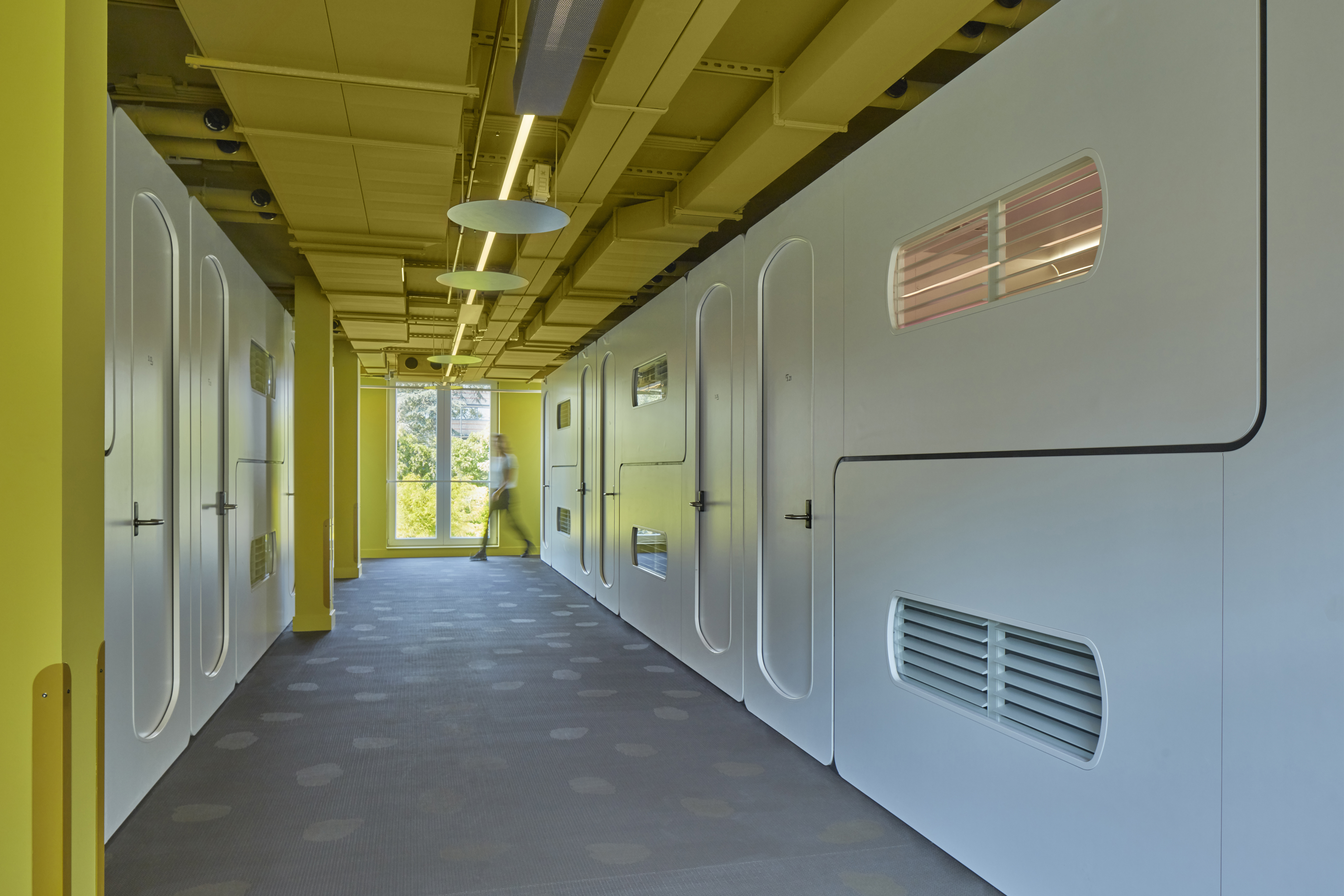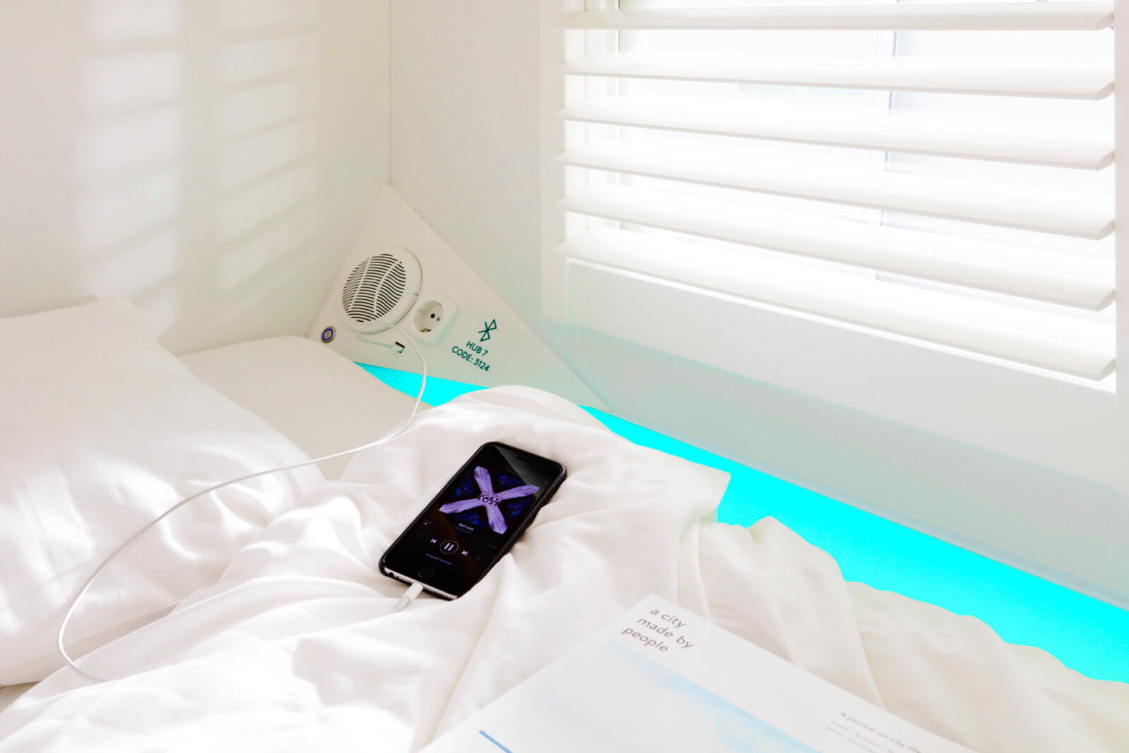 Terwijl de benedenverdieping bruist van de sociale activiteit, blinken de hubs uit in eenvoud en rust. Een kleine instapruimte met beperkte opbergplaats en een beddenbak. That’s it. Strak, wit, proper en rustgevend. En de technologie, die staat uiteraard op punt. Via bluetooth kan je een kleine ingebouwde speaker aan het hoofdeinde van het bed koppelen aan een smartphone of laptop. Ideaal om muziek te luisteren of gezellig een film te kijken. Opvallend is de geïntegreerde en steeds van kleur veranderende verlichting langs de zijkanten van het bed. Te kleurrijk voor jou? Geen probleem, via de app op de smartphone kan je zowaar de verlichting tot in de puntjes afstellen.