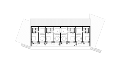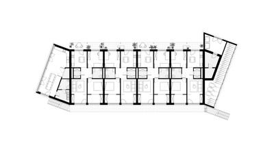 Een bijzonder aspect van Dikken Eik zijn de vier ‘studio’s’ die gekoppeld zijn aan de duplexwoningen. Deze zijn apart ontsloten en kunnen functioneren als semi-autonome units. Dankzij een eigen toegang en een afzonderlijke deur naar de badkamer kunnen ze ingezet worden als zorgunit, studentenkamer of gedeelde woningcomponent. Ook gebruik als atelier of praktijkruimte behoort tot de mogelijkheden. Zo ontstaat een flexibel woonmodel dat inspeelt op verschillende levensfasen en samenlevingsvormen.