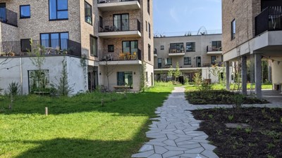 In de buitenruimte is er zo weinig mogelijk verharding en indien nodig wordt gekozen voor waterdoorlatende alternatieven: gefundeerd gras, beton met een voeg… Het zorgt voor meer groen én minder problemen met de waterhuishouding.