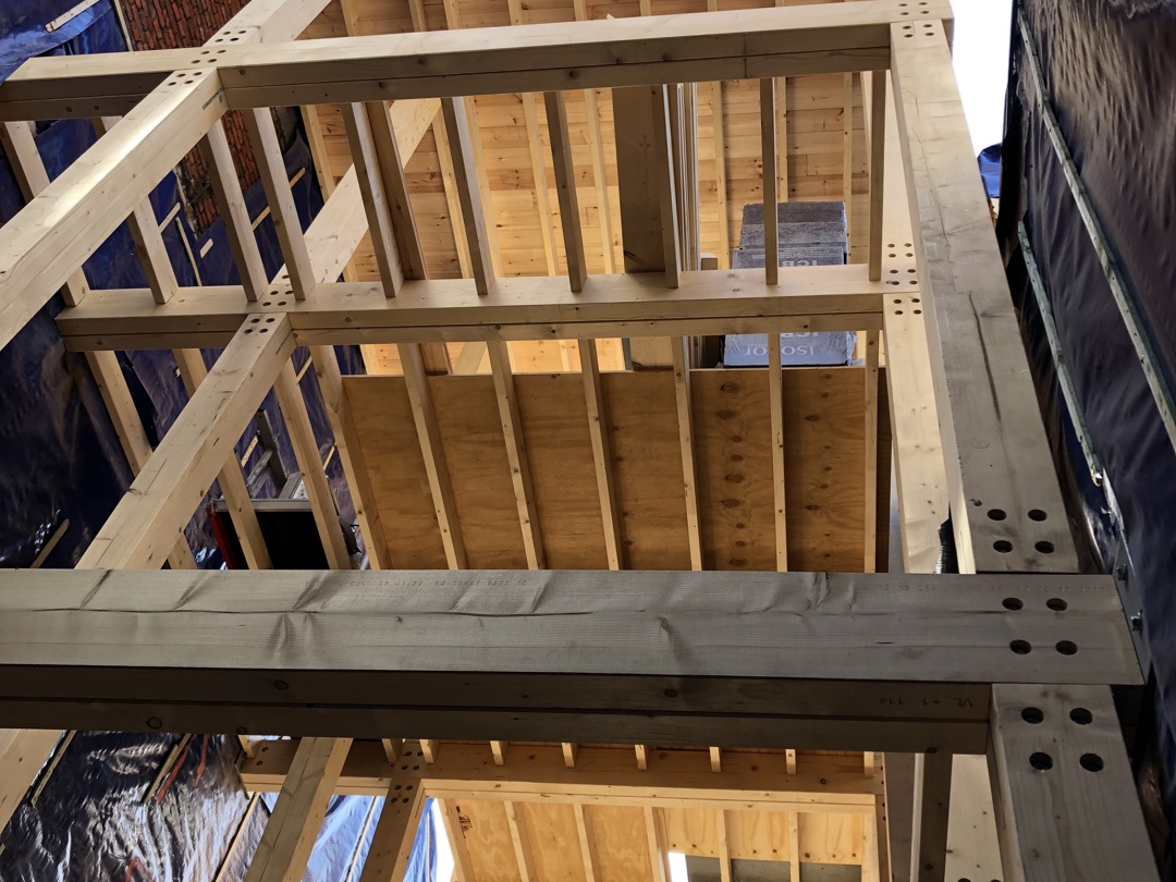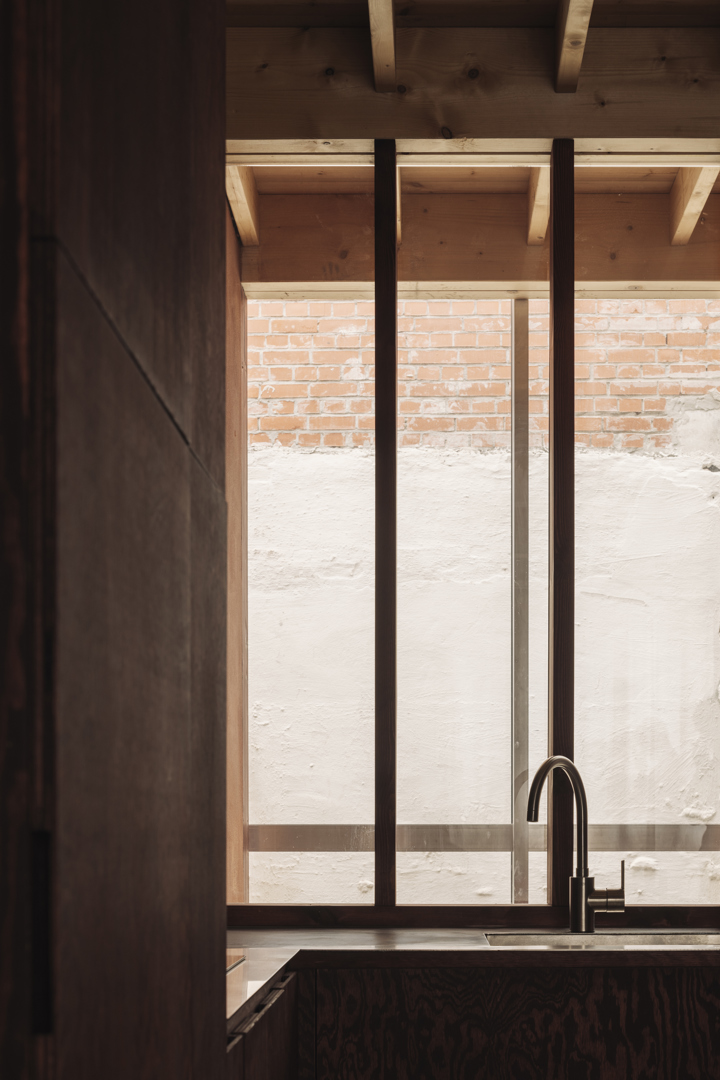 In totaal was, dak en houtskeletwanden inbegrepen, zo’n 9,5 m³ hout nodig voor de structuur. Dat die hoeveelheid zo bescheiden is, heeft niet enkel te maken met de grootte van de woning, maar ook met het feit dat BC architects & studies en Sidati ervoor kozen de gemene muren gewoon af te werken met kalkpleister en er geen nieuwe houten muren tegenaan te bouwen, om de breedte van de woning te maximaliseren.