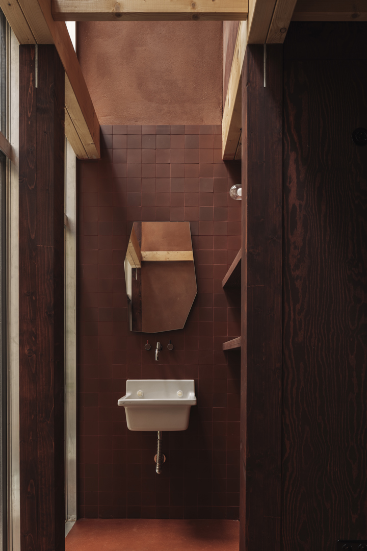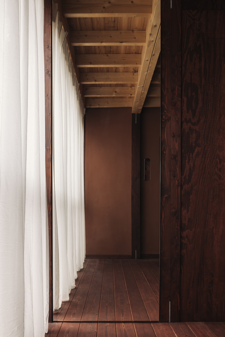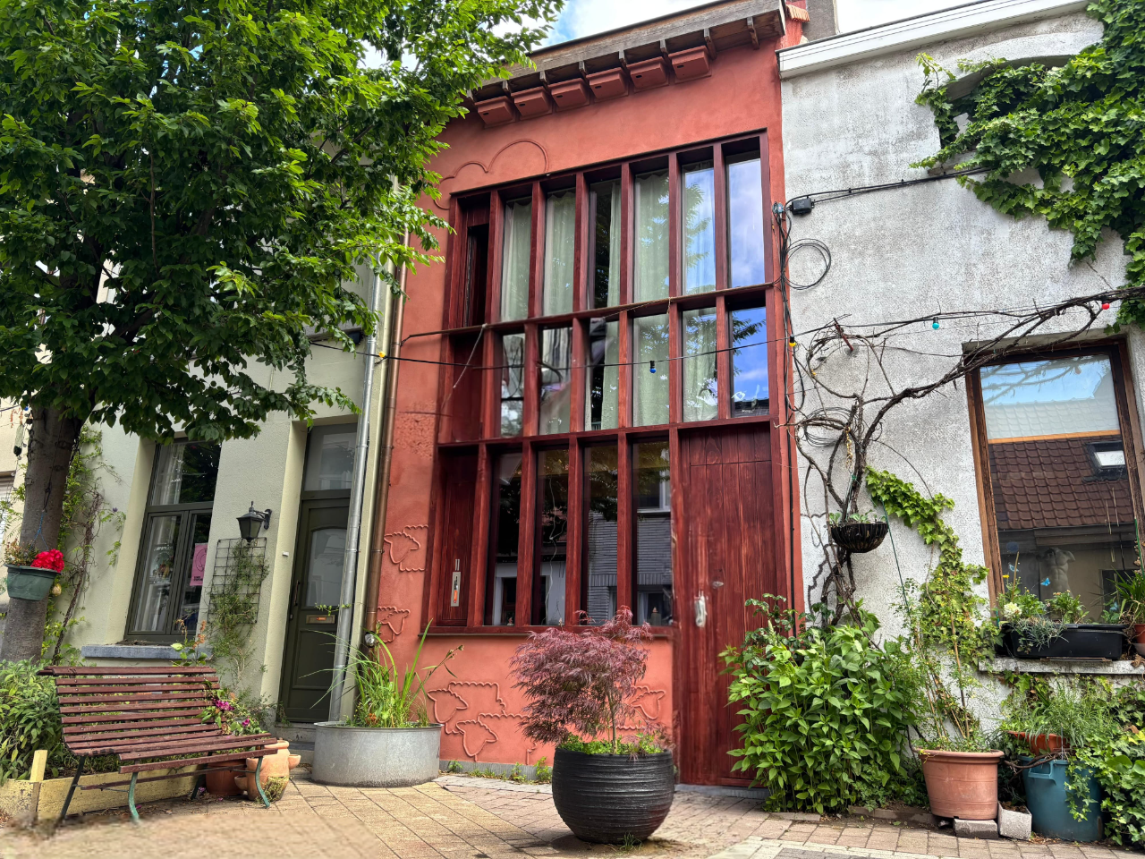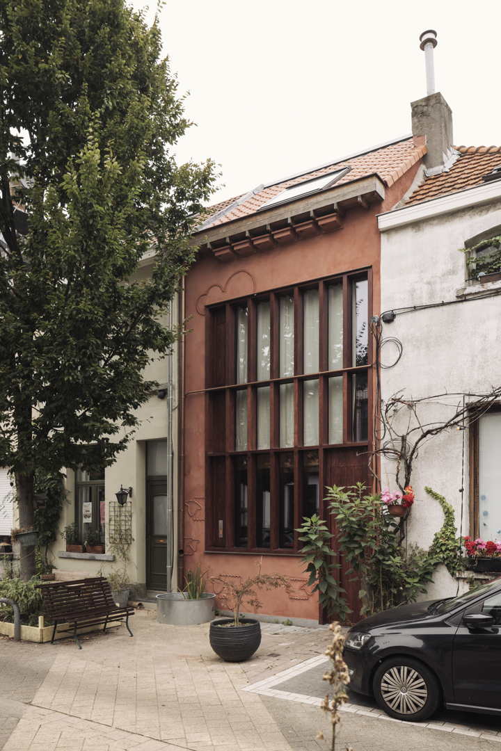 Zowel het buitenschrijnwerk als al het zichtbare hout aan de binnenkant van de woning, zoals de vloeren en de trap, werden donker geolied. Dat zorgde er in combinatie met de vorm van het buitenschrijnwerk en de aardse kleuren van de gebruikte leem en kalk voor dat de woning een beetje Japans oogt. Volgens BC architects & studies en Sidati past de nieuwe woning door haar uiterlijk ook mooi bij de andere huizen in de straat, die “dorpser aanvoelt dan de doorsneestraat in de Sinjorenstad”.