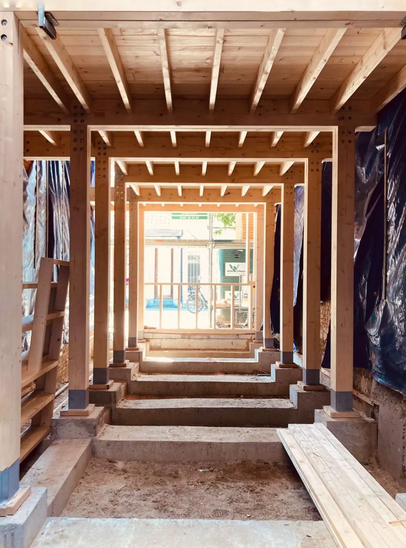 De opdrachtgever kon zich vinden in de ambitie van BC architects & studies om de nieuwe rijwoning, die zou bestaan uit een gelijkvloers niveau en twee verdiepingen, te realiseren met zo veel als mogelijk biogebaseerde materialen – de forte van het ontwerpbureau. De woning moest dan ook een houten skelet krijgen. Dat werd een paal- en balkstructuur, met balkenroosters voor de vloeren, dat in slechts enkele weken tijd werd opgetrokken door Sidati. Voorafgaand aan die werken moest een van de twee naastgelegen woningen wegens een gebrek aan fundering wel nog onderschoeid worden – Buro Kiss verzorgde de stabiliteitsstudie.