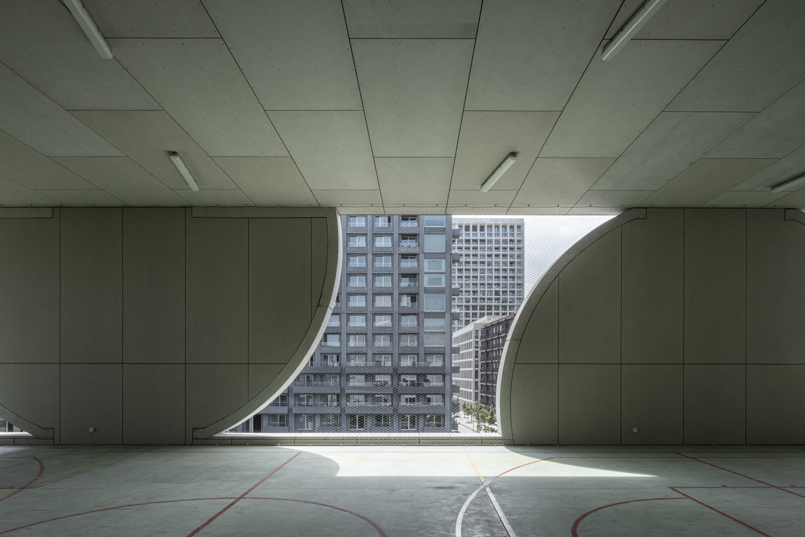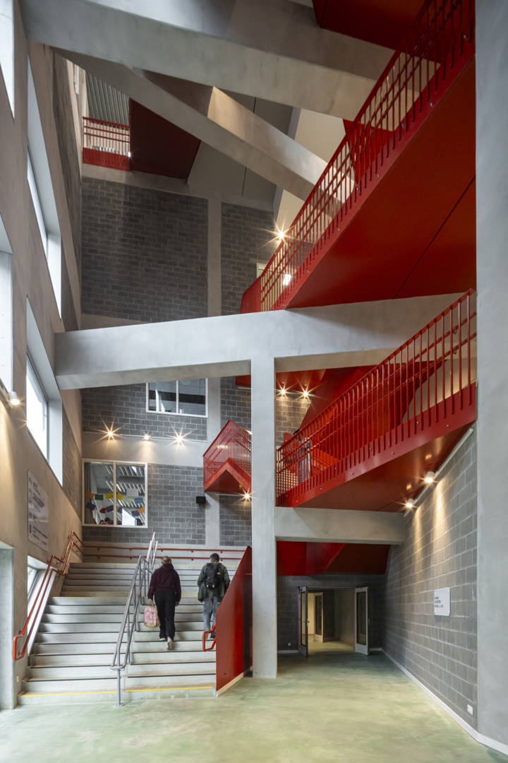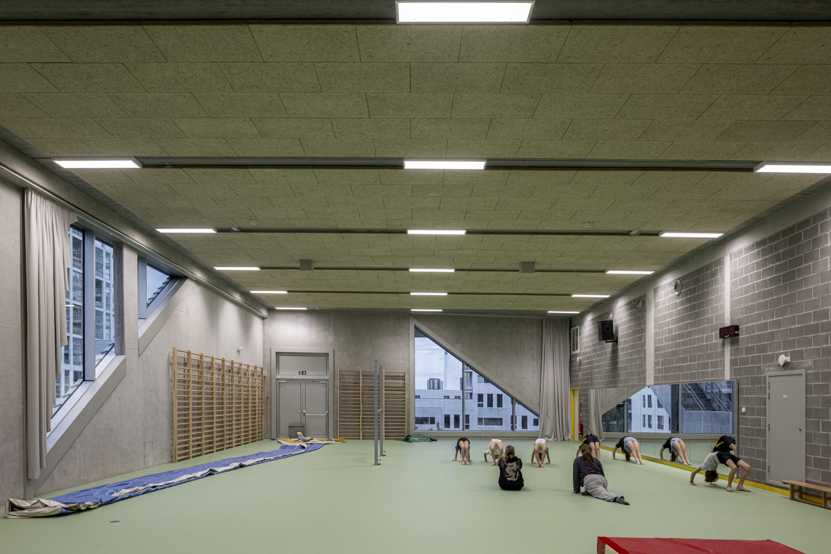 De twee scholen zijn compact gestapeld en opgevat als duplexen rond een gedeelde learning street, die het hart van het onderwijsprogramma vormt. Op het gelijkvloers bevinden zich de gemeenschappelijke functies, terwijl hogere niveaus plaats bieden aan onder meer een kleine turnzaal en een overdekte speelplaats. Helemaal bovenaan ligt de grote sporthal, losgetild van het maaiveld.